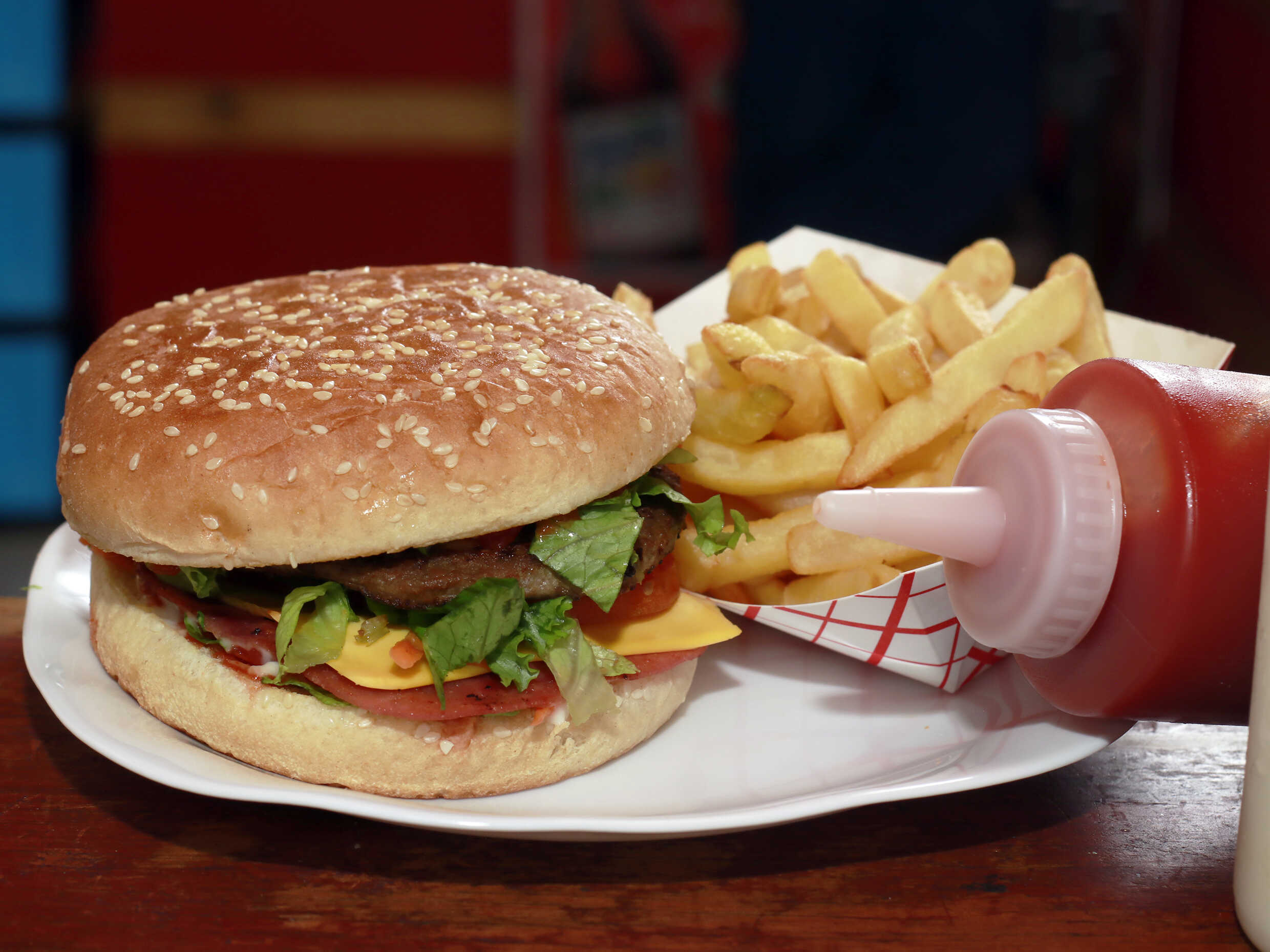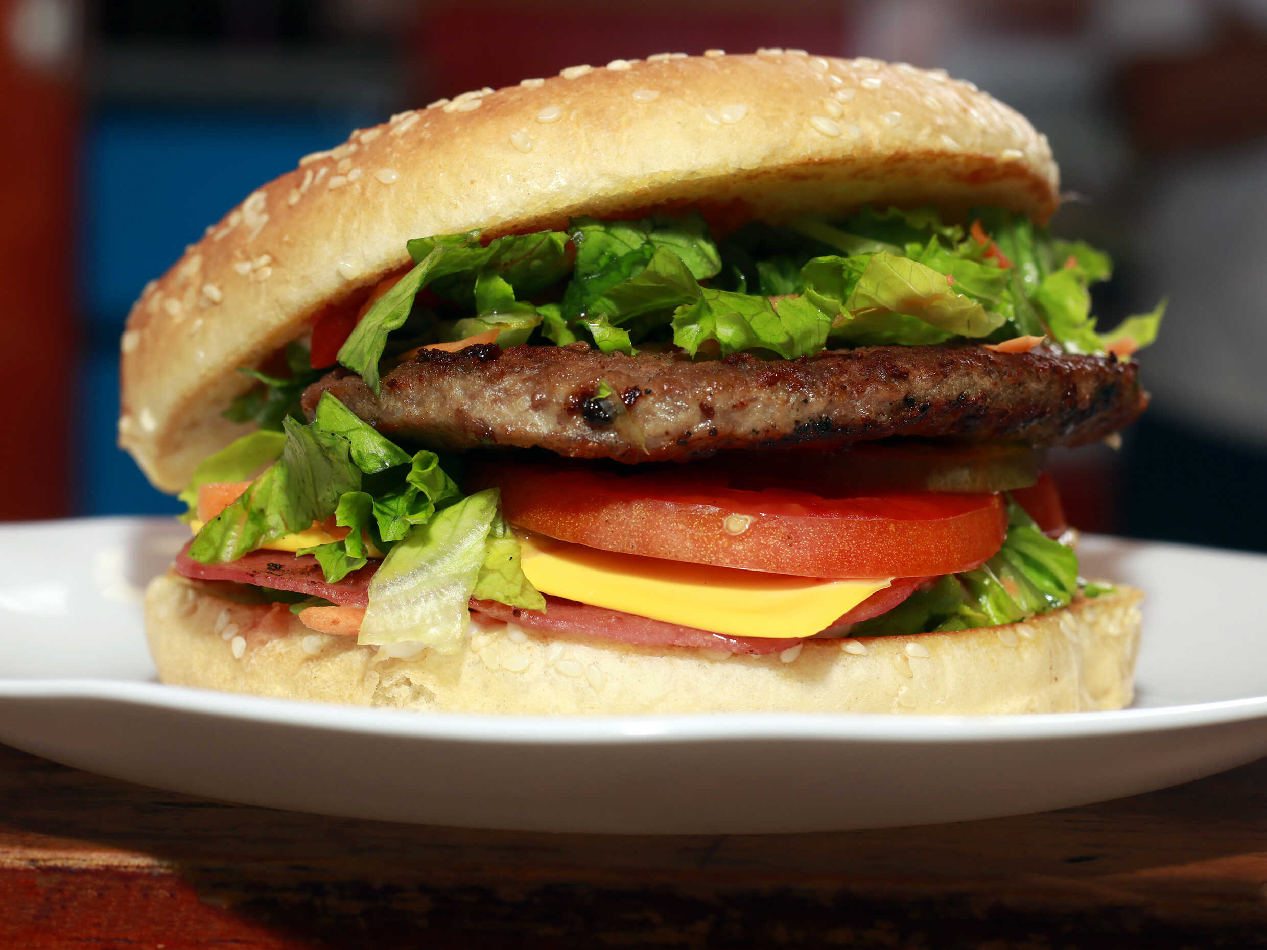 Pan, torta 100% carne de 1/4 de lb, queso, jamón, lechuga, tomate, cebolla, pepinillos, salsa de tomate y mayonesa.