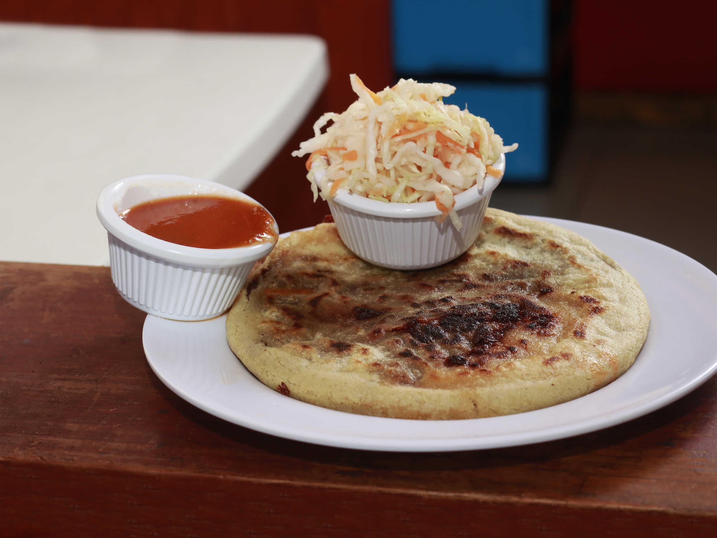 Pupusa rellena de queso y chicharrón. Acompañada de salsa de tomate y ensalada de repollo.