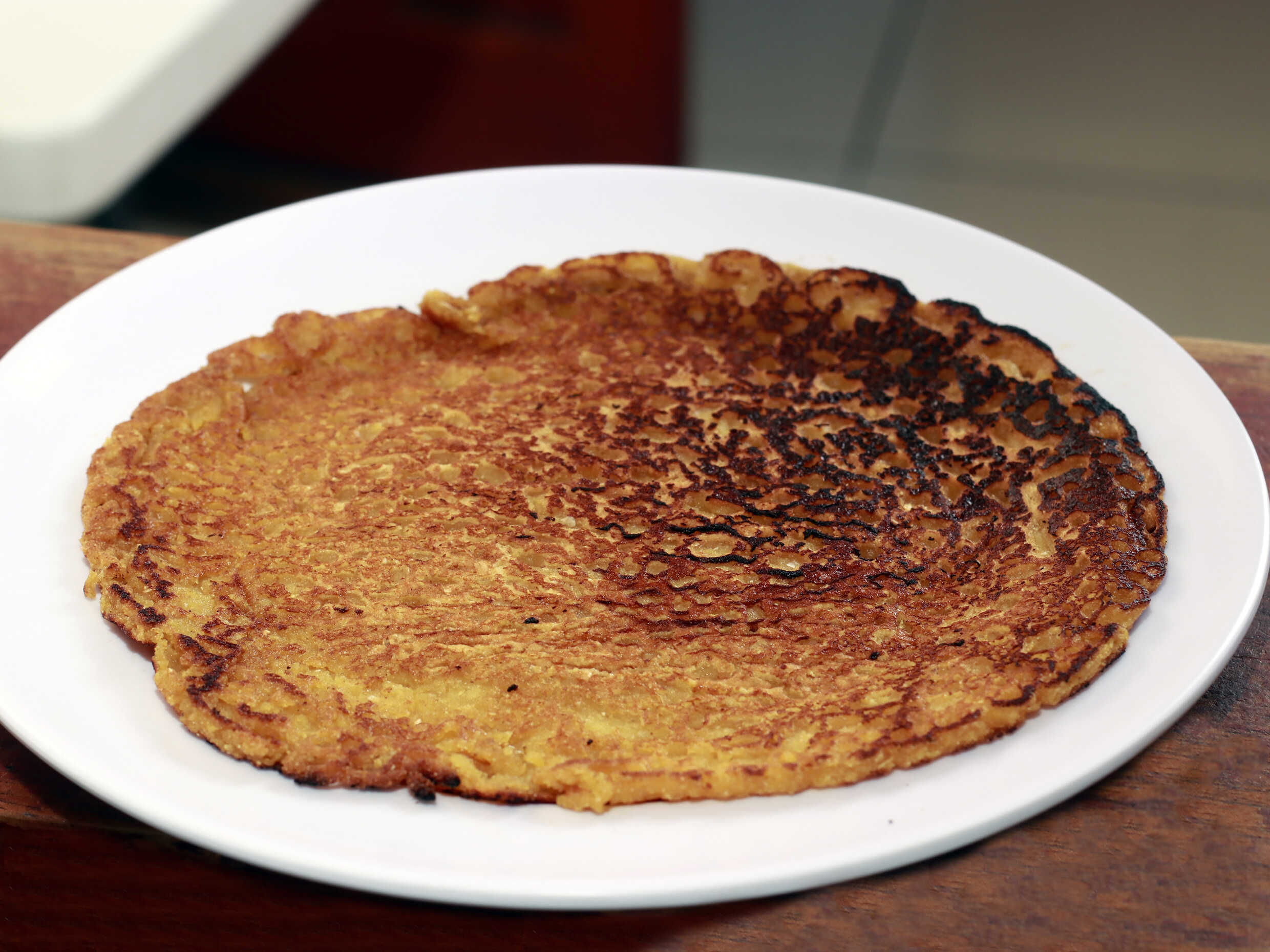 Pupusa rellena de chicharrón. Acompañada de salsa de tomate y ensalada de repollo.
