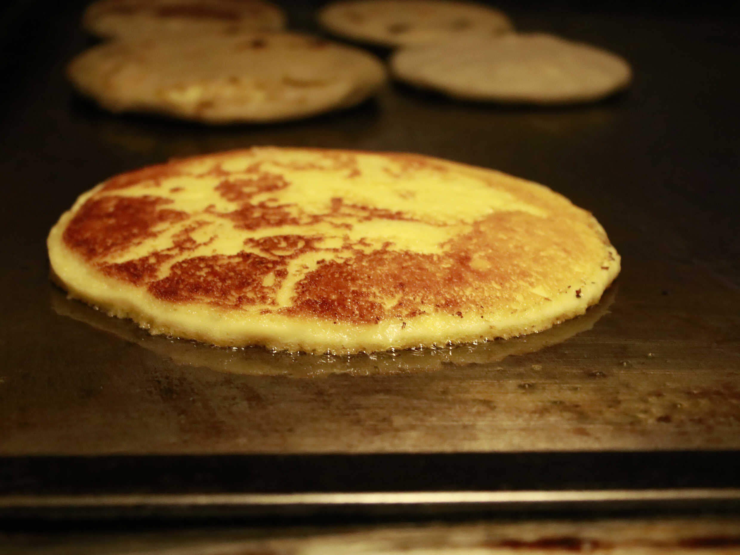 Pupusa rellena de chicharrón y frijol. Acompañada de salsa de tomate y ensalada de repollo.