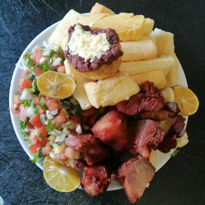 Orden de chicharrones (vigorón) con yuca, patacón y ensalada.