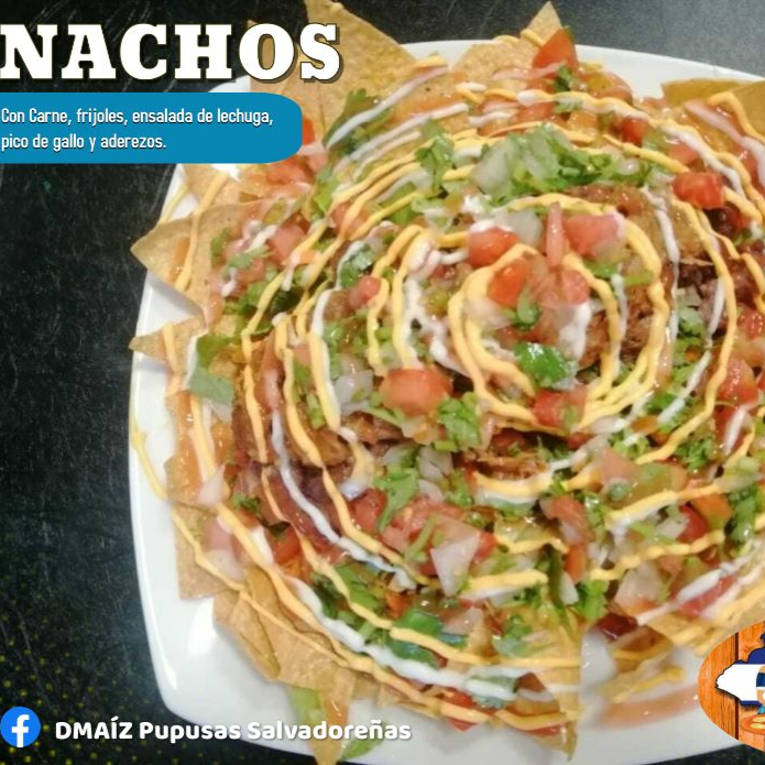 Nachos con lechuga, pico de gallo, frijoles, carne mechada de res, mayonesa, salsa de tomate y queso líquido.
