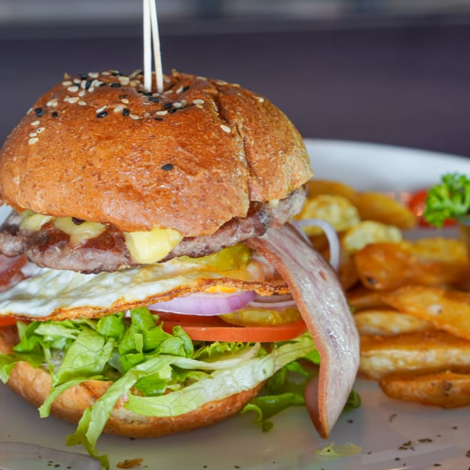 Pan artesanal, lechuga, tomate, pepinillos, cebolla, tocineta, torta de res y cerdo de 180 gramos, huevo frito, queso amarillo o blanco, aro de cebolla. Acompañada con papas en gajo y una salsa especial.
