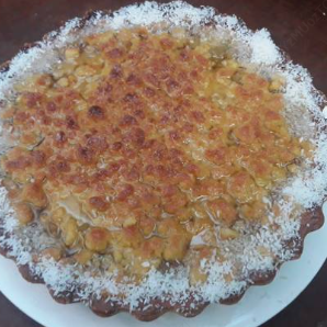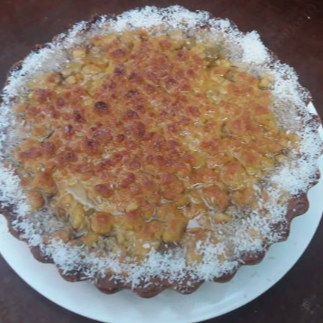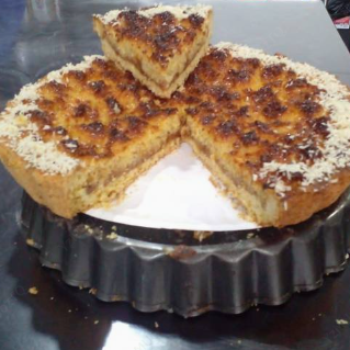 Tarta de coco con masa de frola, dulce de leche y pasta de coco.