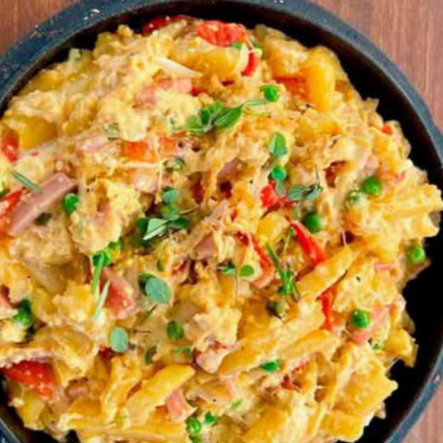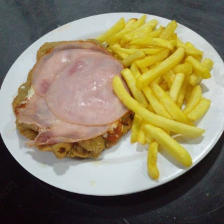 Papas Fritas con carne de cerdo, Arvejas y huevo revuelto con mozzarella gratinada.