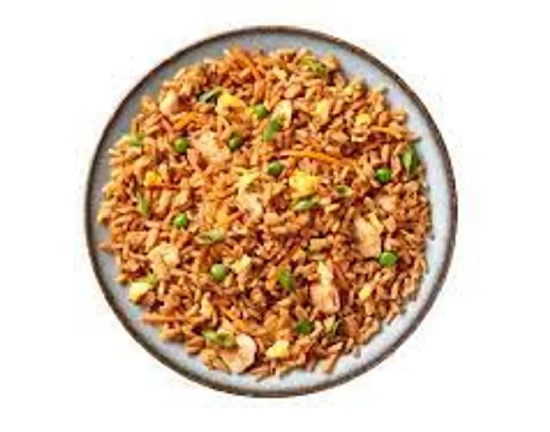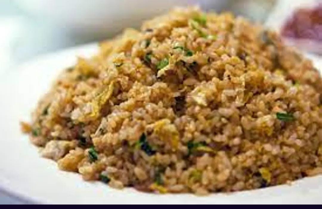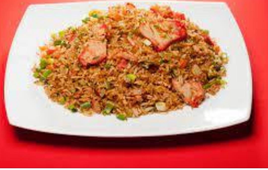 Arroz frito, cebolla china, raices chinas, , , carne de cerdo y pollo.