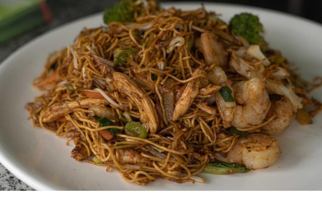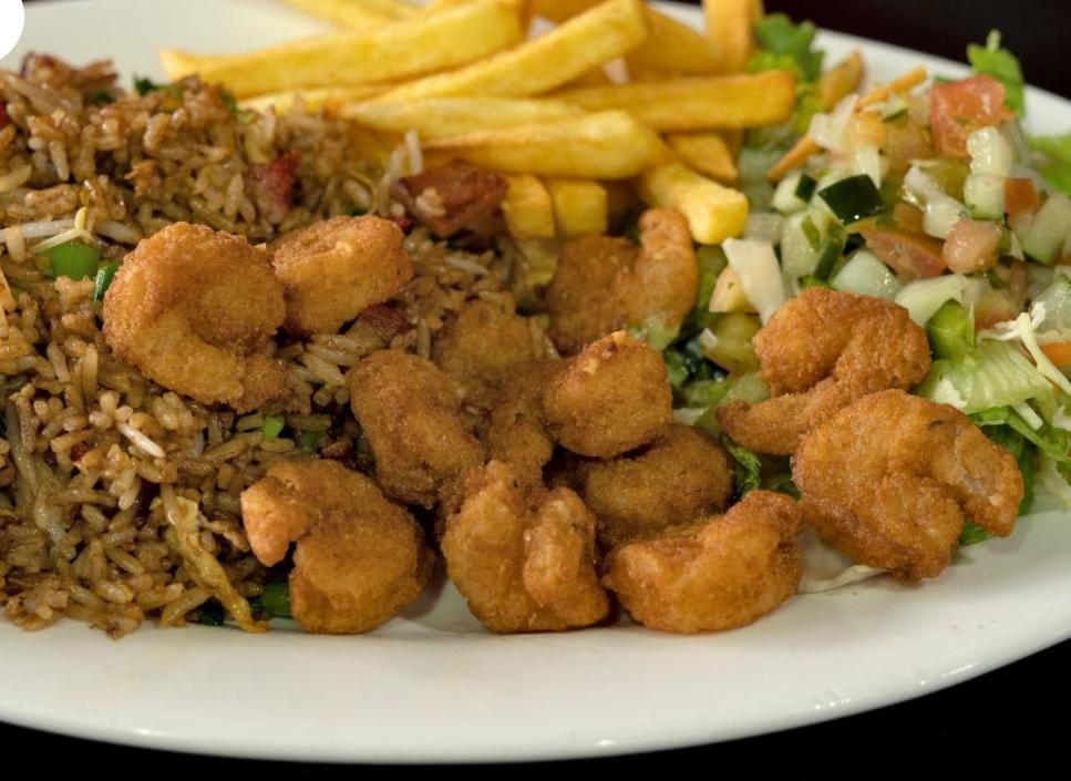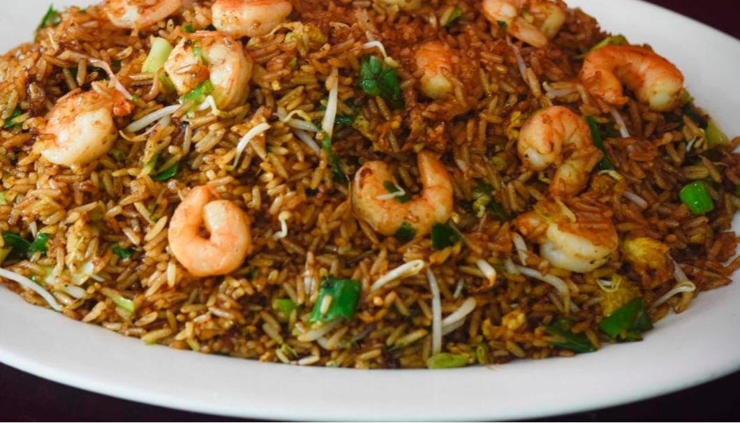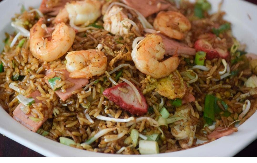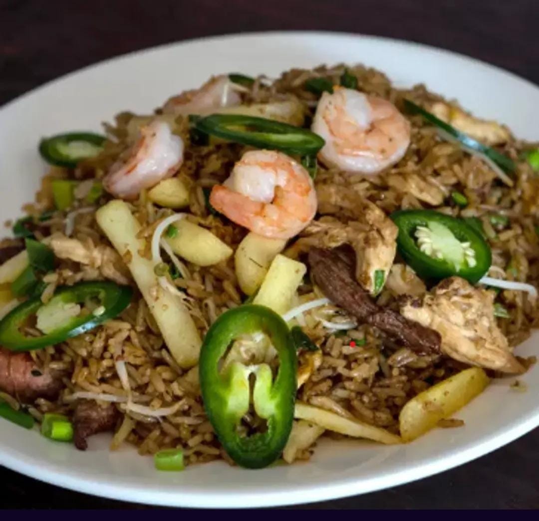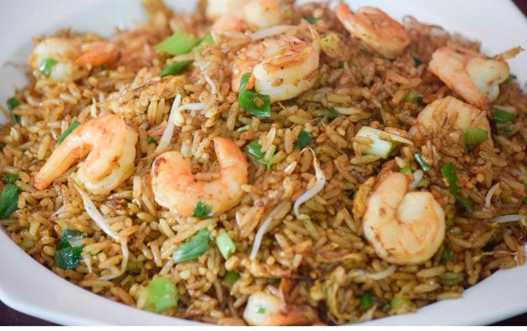 Arroz frito, cebolla china, raices chinas, repollo blanco, ajo, pollo y camarones.