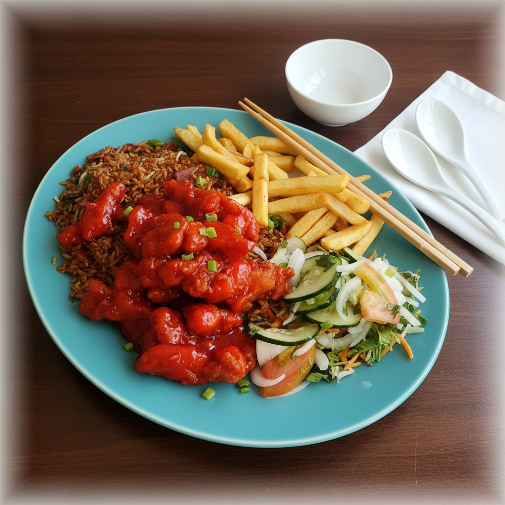 pollo agridulce, arroz cantones, ensalada y papas
