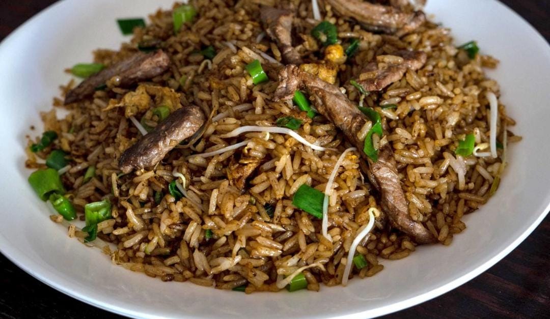 Arroz frito, cebolla china, raices chinas, repollo blanco, ajo, y carne de res