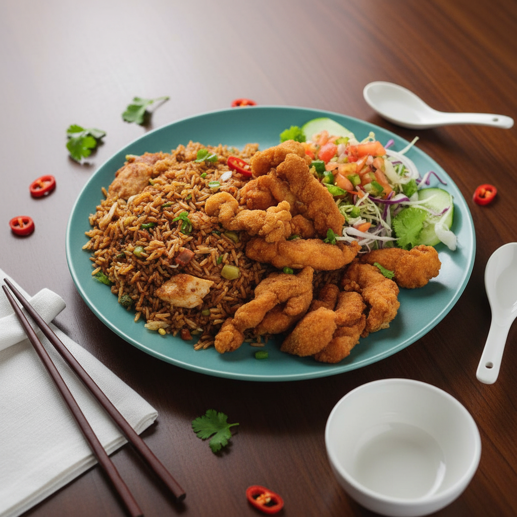 mitad arroz cantones y mitad chow suey en salsa