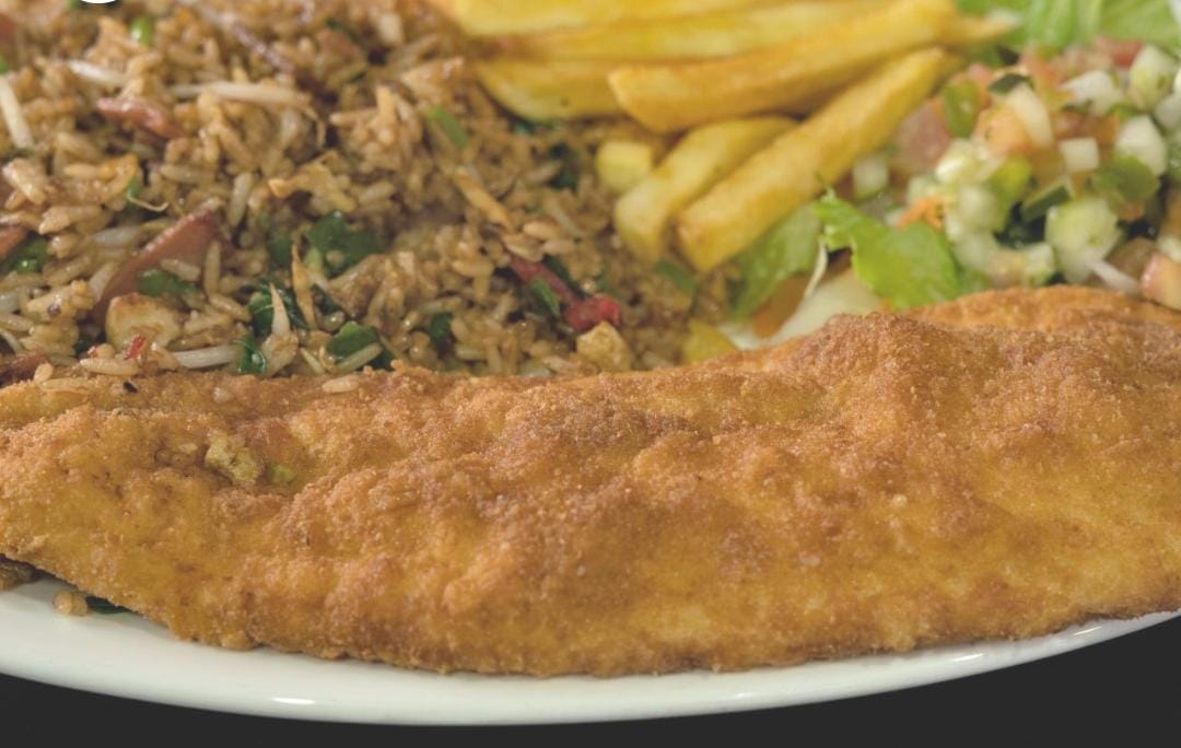 filete de pescado empanizado, arroz cantones, ensalada y papas