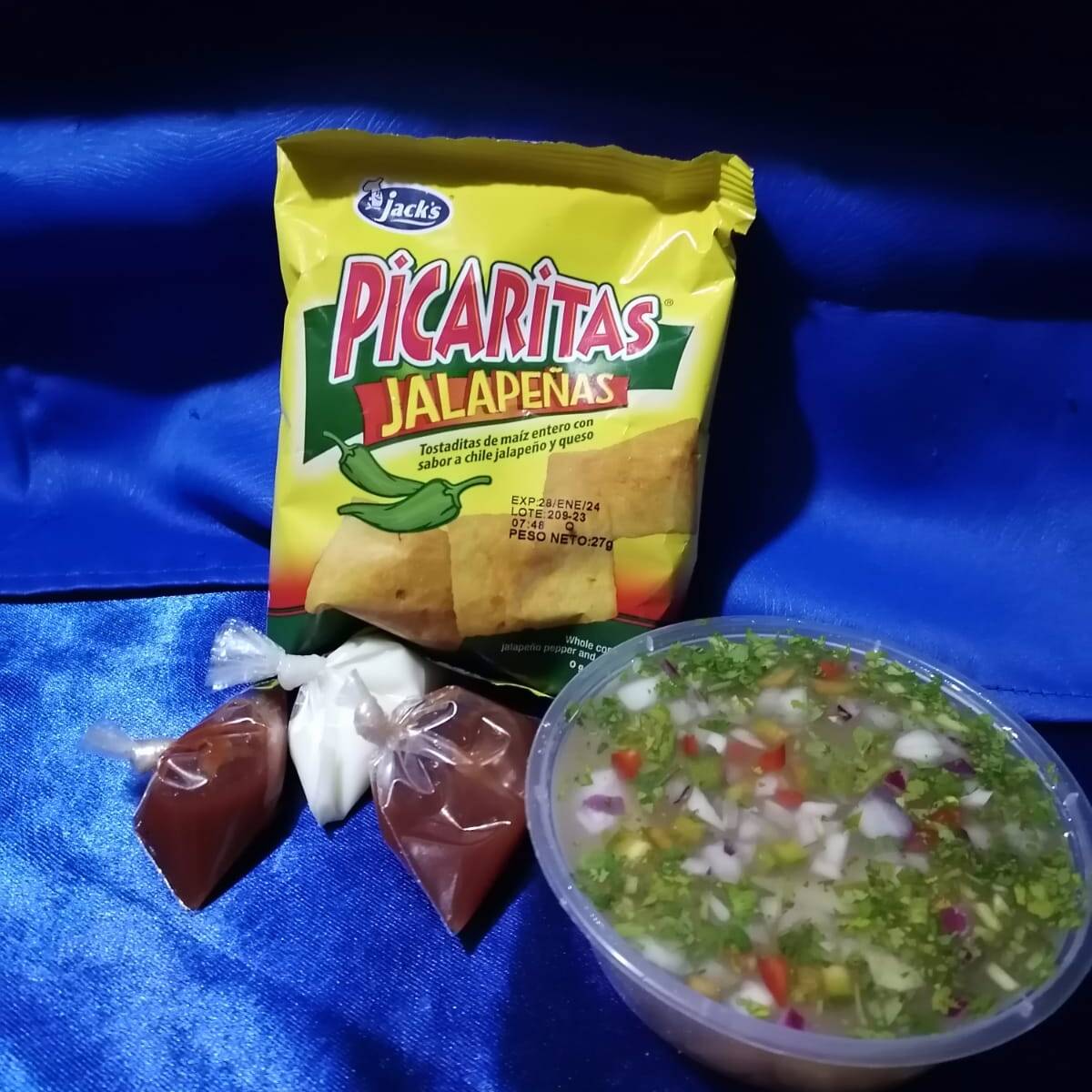 rica calsoda de pescado con su chilito y salsas por aparte + picarita de la jacks.