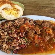 gallo pinto con carne en salsa