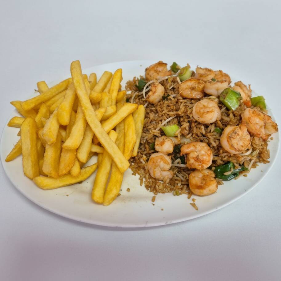 Arroz preparado en wok con camarones, pollo, brócoli y zanahoria.