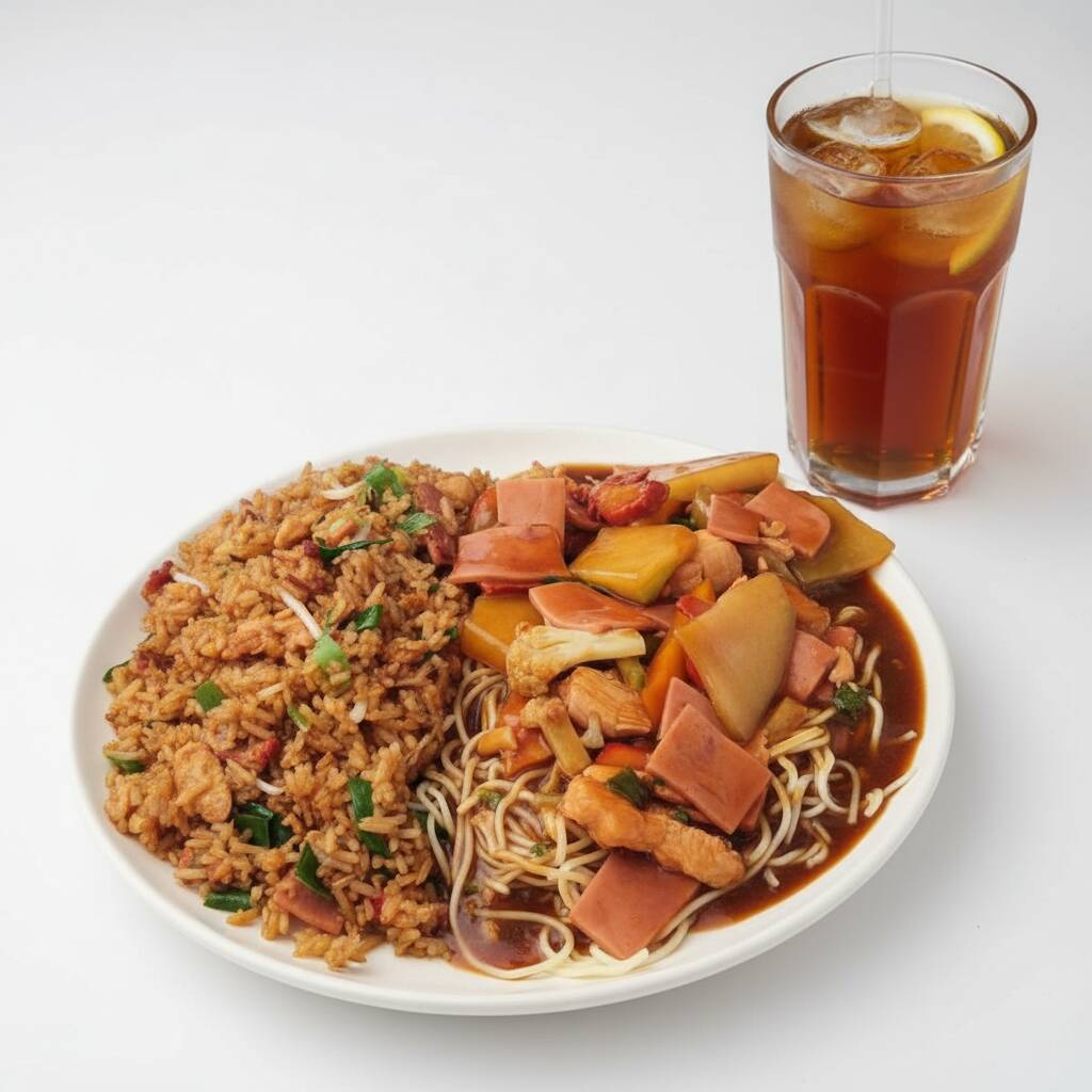 Porción de arroz cantones y chop suey en salsa + Té Frío de la Casa.