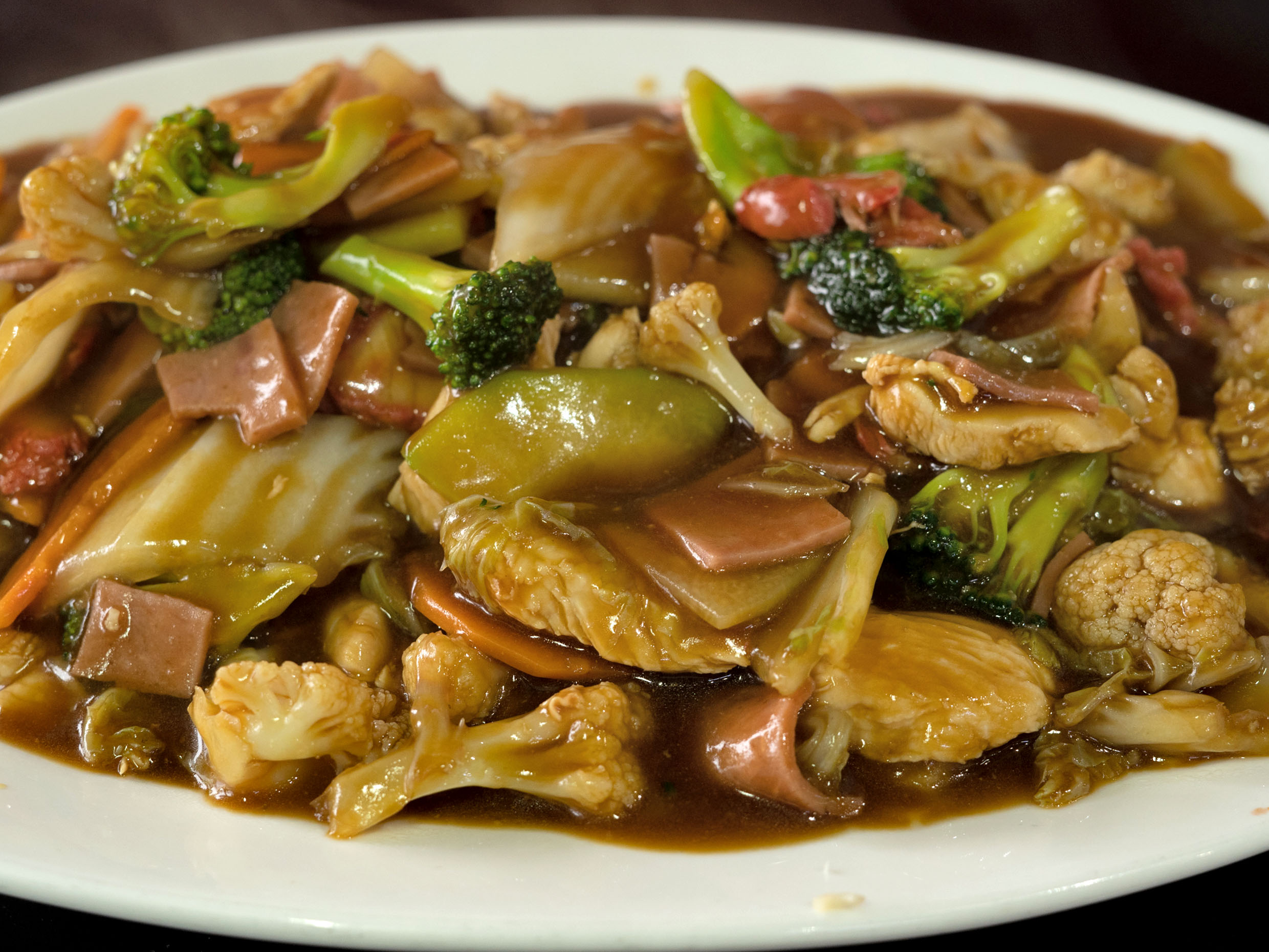 Tradicional chow mein de la casa con pollo, lechón, camarón, brócoli y zanahoria.