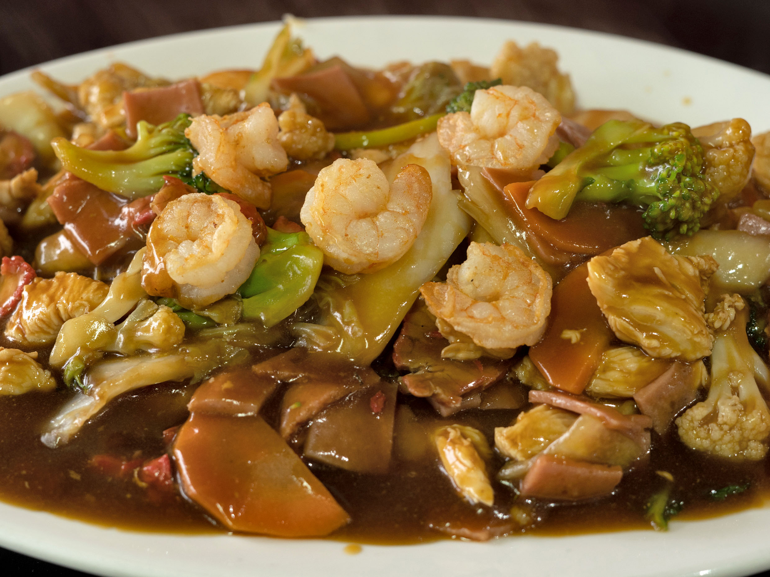 En salsa o seco. Tradicional chop suey preparado wok con camarones.