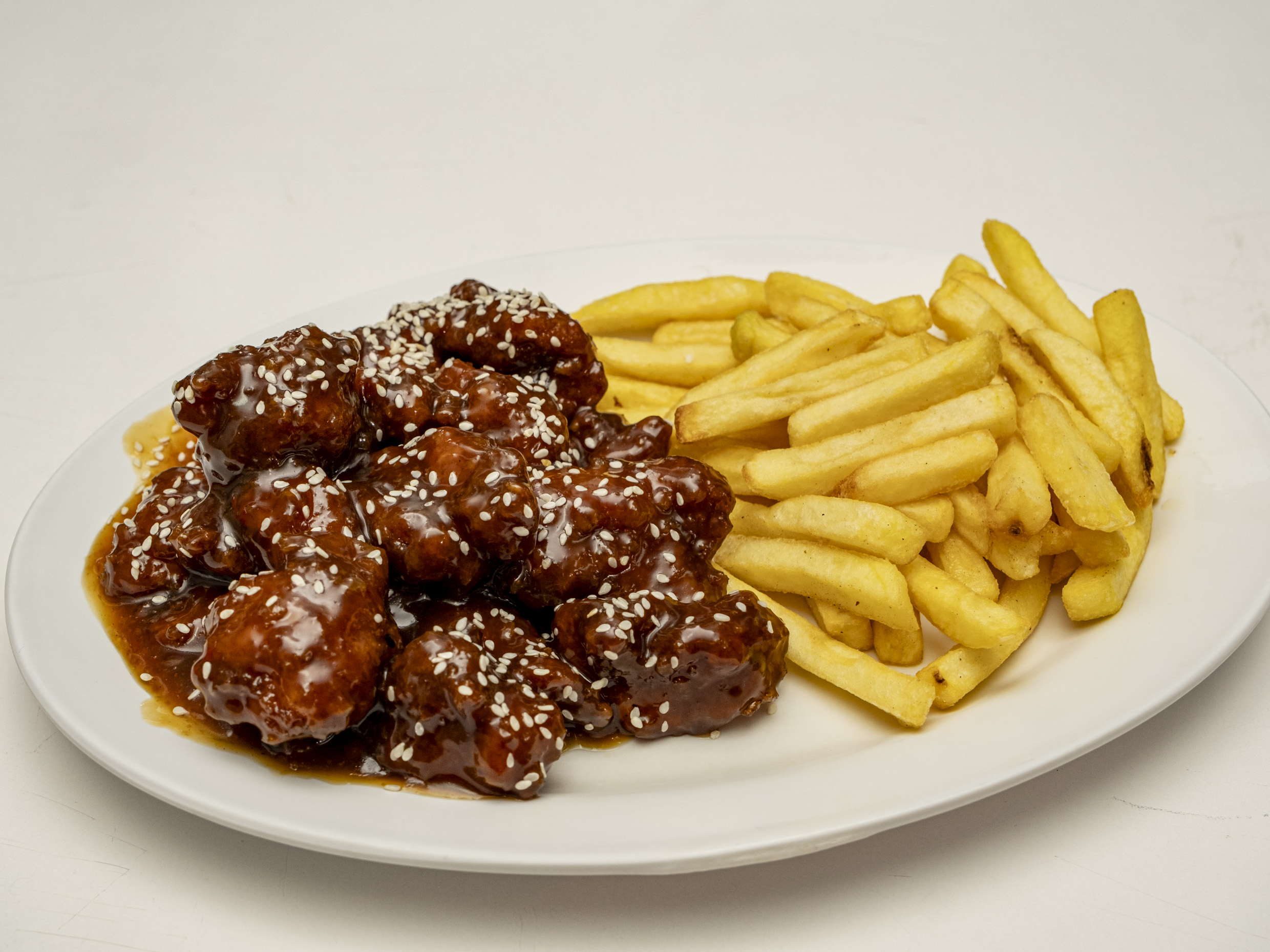 250 gramos de Pollo en Salsa + 1 Porción a escoger entre papas fritas o arroz blanco