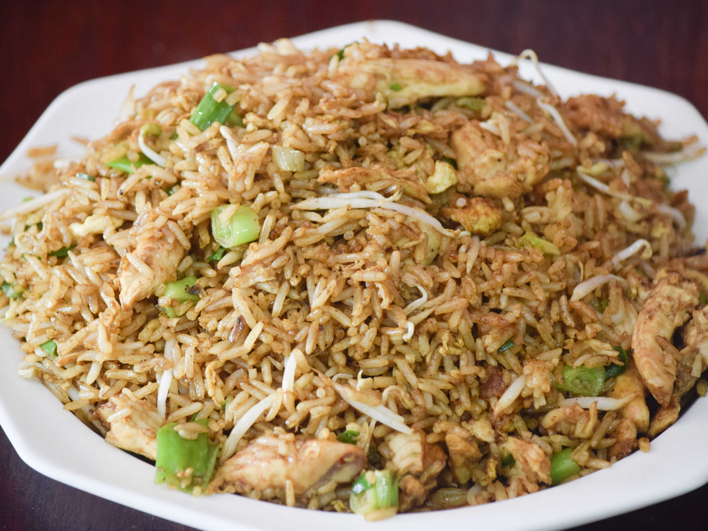 Arroz frito con Pollo preparado en Wok, con frijol nacido, cebollino y huevo.