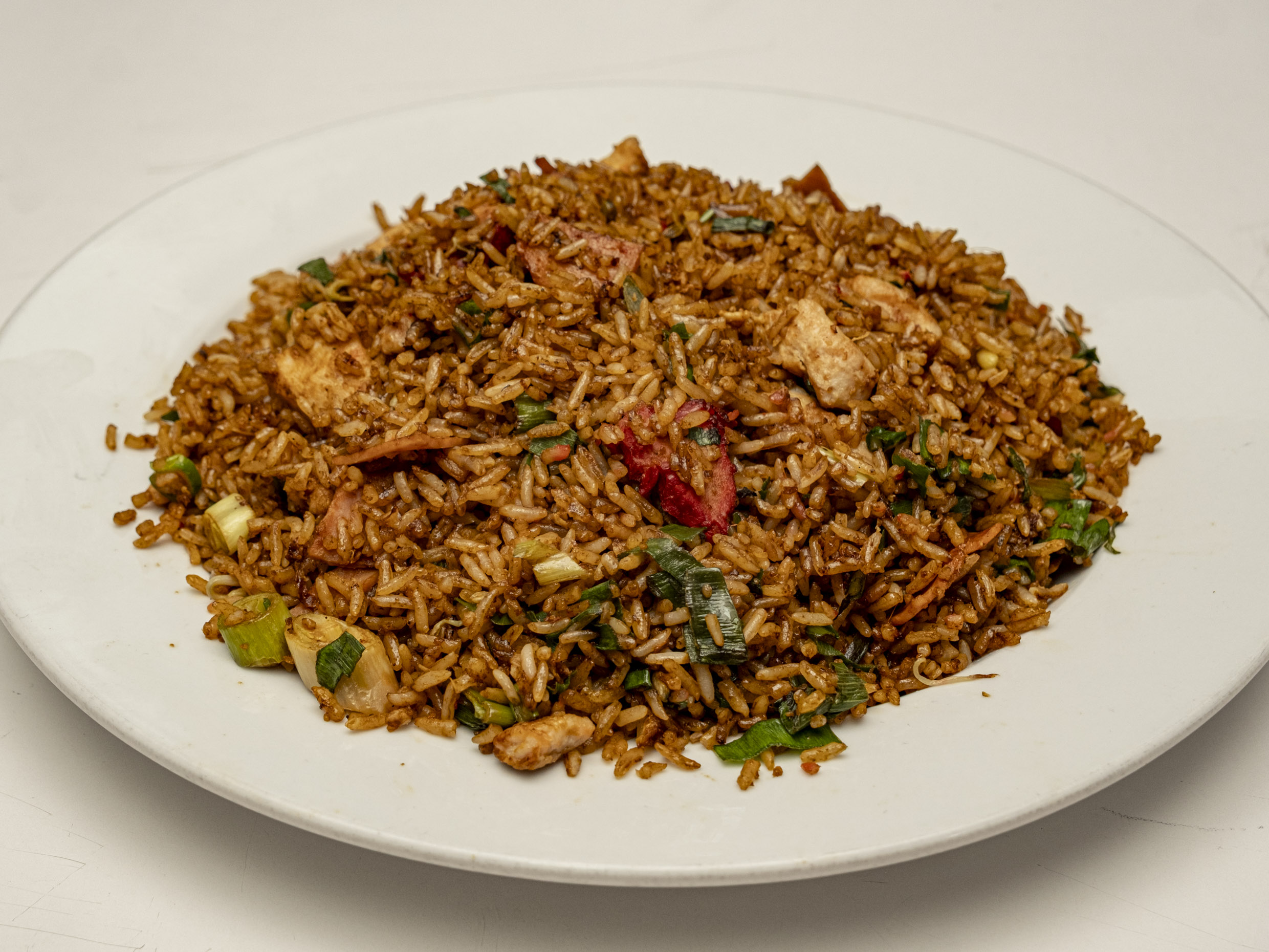 Arroz preparado en wok con pollo, jamon, lechon, carne y chile jalapeño.