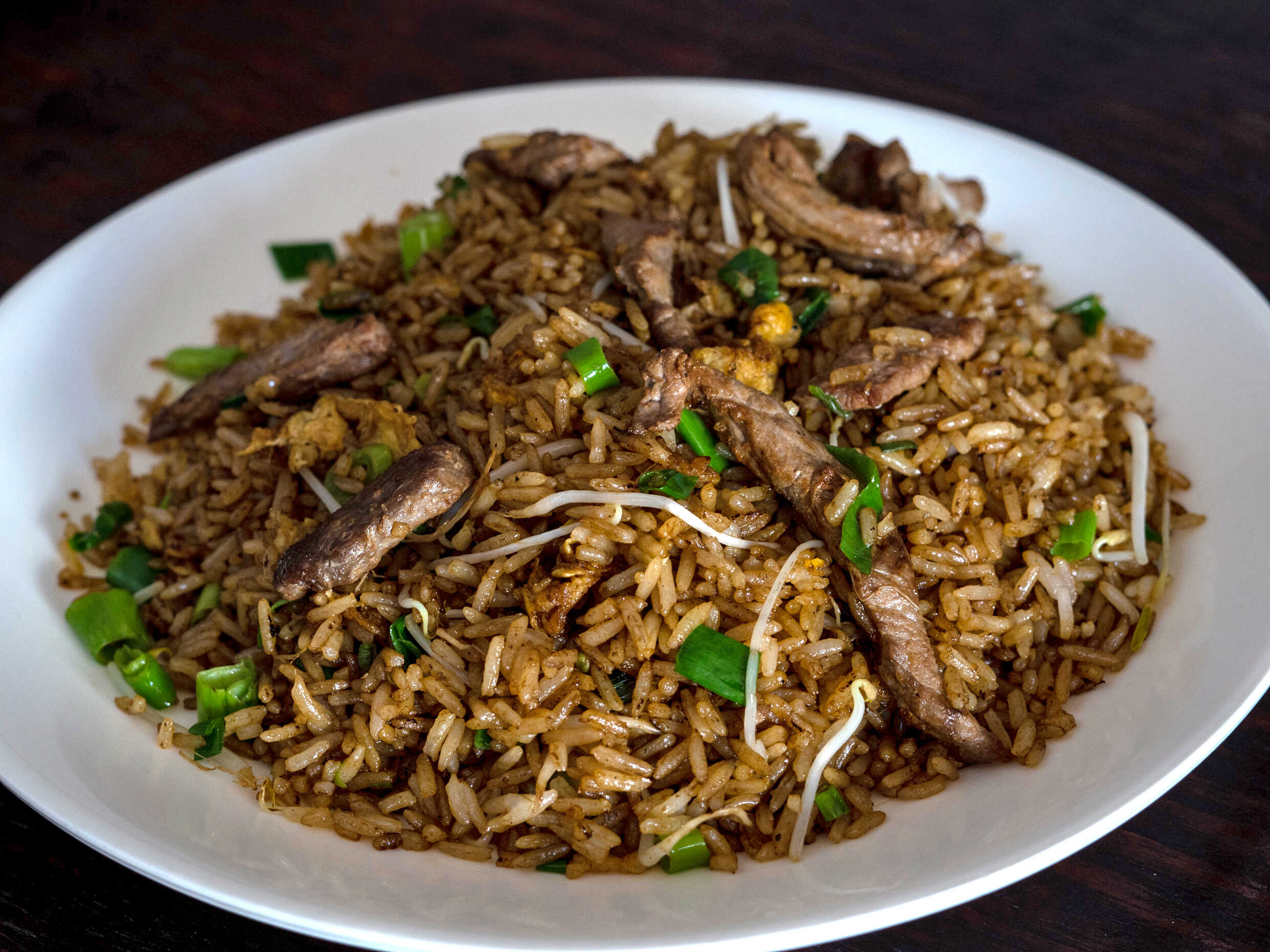 Arroz preparado en wok con carne de res, brócoli y zanahoria.