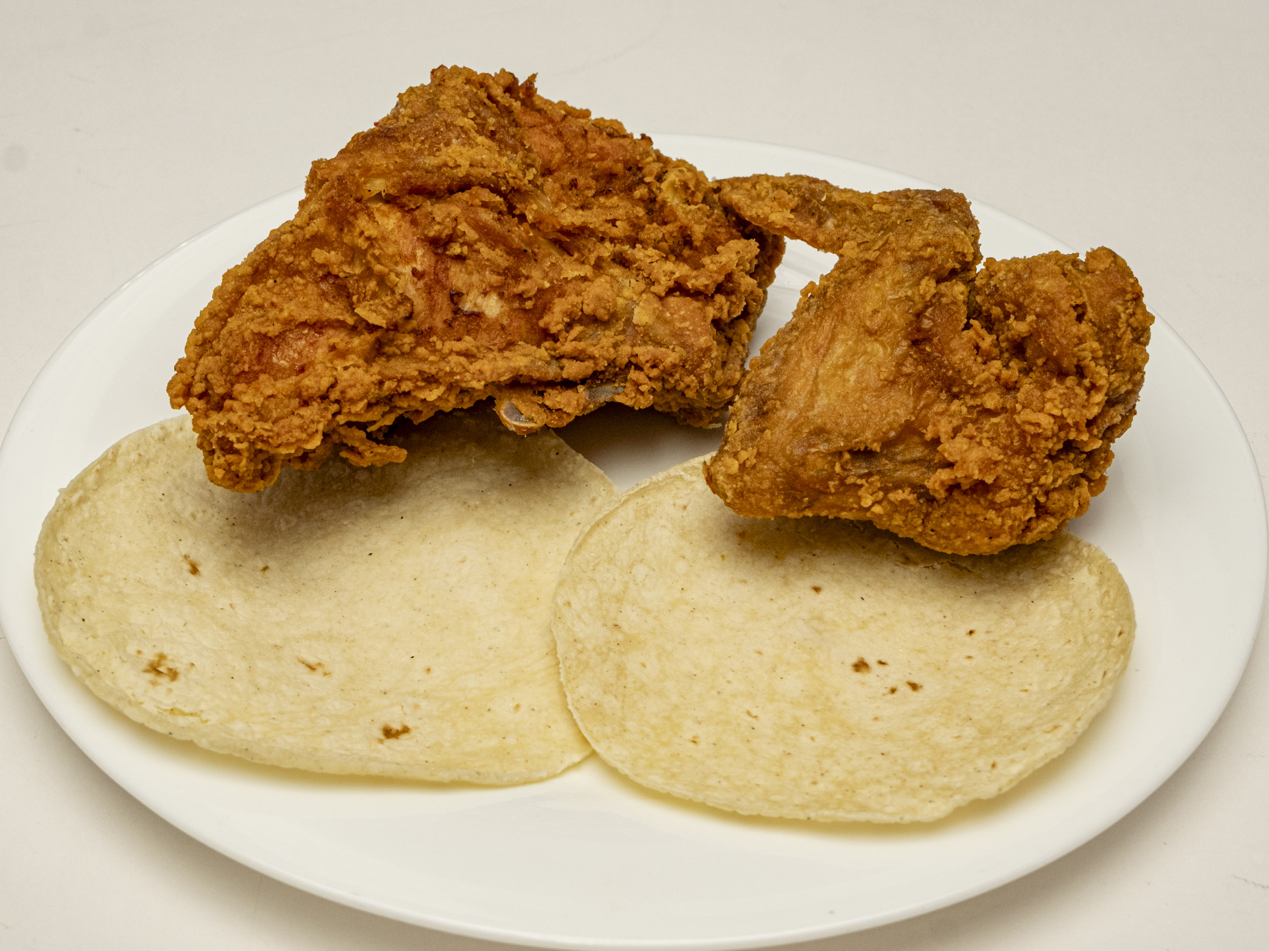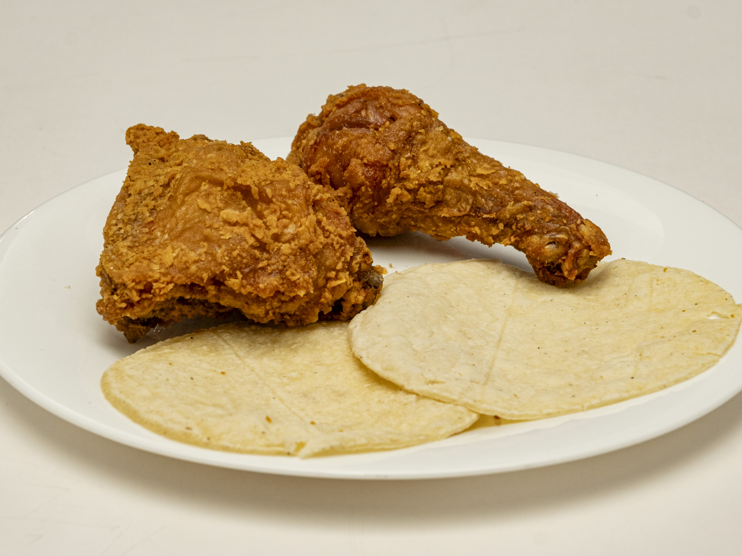 Porción de pollo frito 1/4 de muslo acompañado de papas fritas