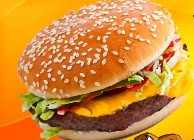 Hamburguesa ingredientes: Torta de carne, lechuga, queso, jamón, tocineta, cebolla y salsas de la casa, acompañada de papas fritas y refresco (sabor disponible)