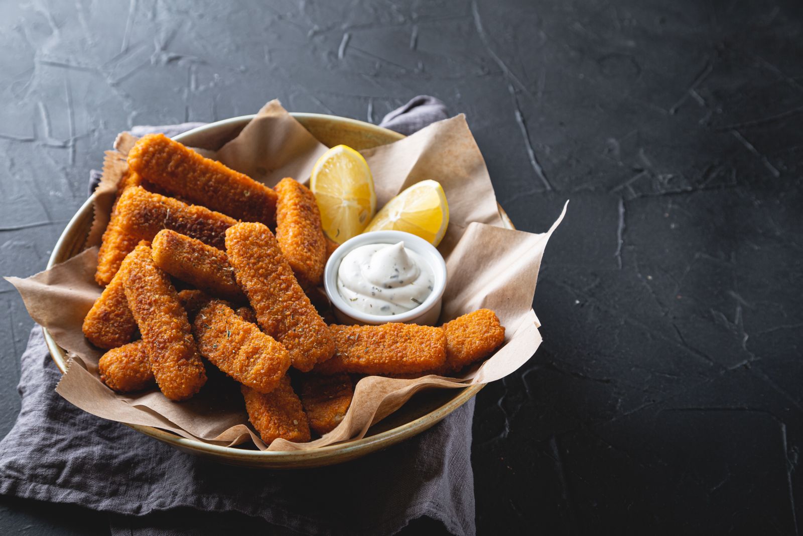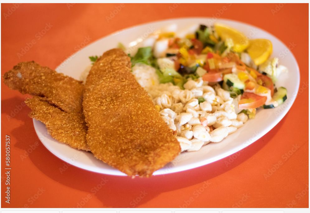 7 palitos de pescado, papas pequeñas o patatas y ensalada de caracolitos y 2 salsas Ranch y Mostaza miel