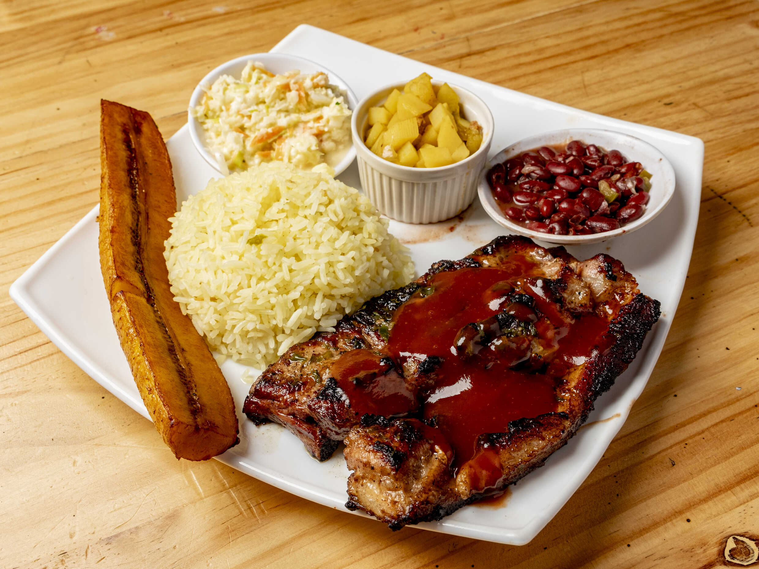 Costilla a la parrilla 250gr, 3 patacones, guacamole, pico de gallo, frijoles molidos y ensalada