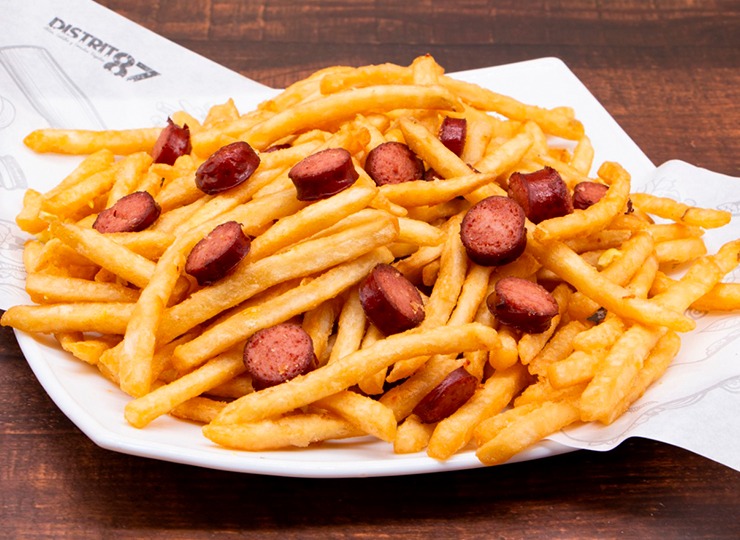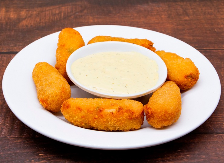 Palitos canadienses, rellenos de papa rayada revuelto con queso cheddar y trocitos de jalapeño empanizado acompañados de la salsa Distrito (opción vegetariana)