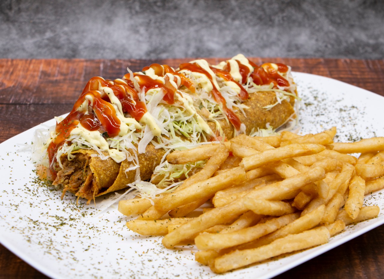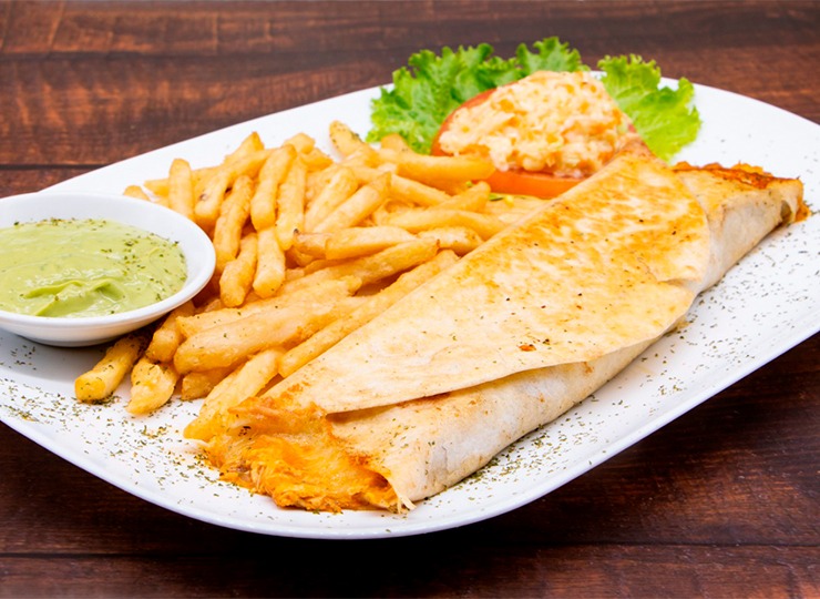 Gran burrito, por dentro con frijoles molidos, queso mozarella, proteína a elegir, con ensalada y papas fritas