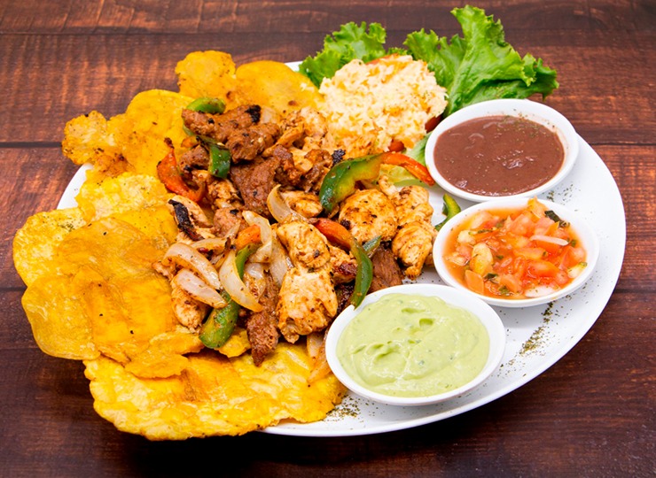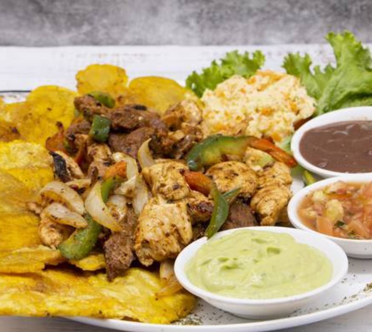Patacon, fajitas mixtas con chile cebolla, frijoles molidos, guacamole, ensalada y pico de gallo, 5 unidades