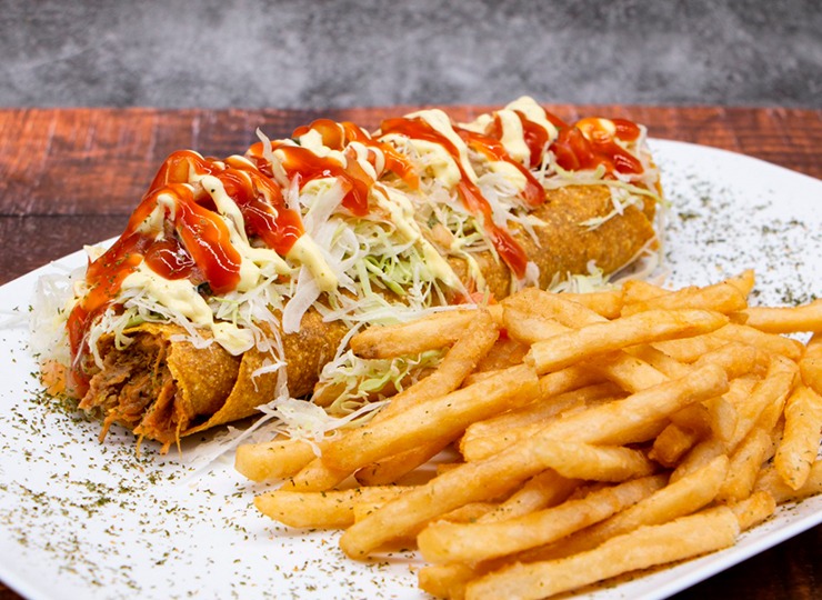 2 deliciosos súper tacos a lo tico en tortilla de maíz, estilo flauta, rellenos de carne mechada, acompañados de papas fritas