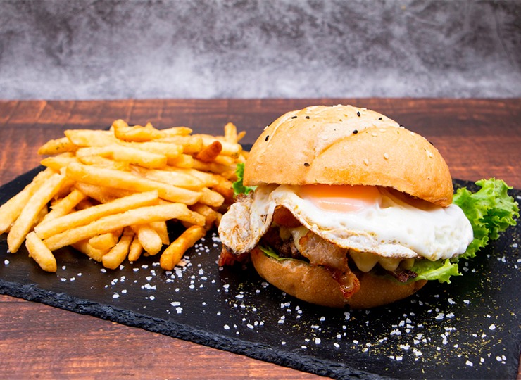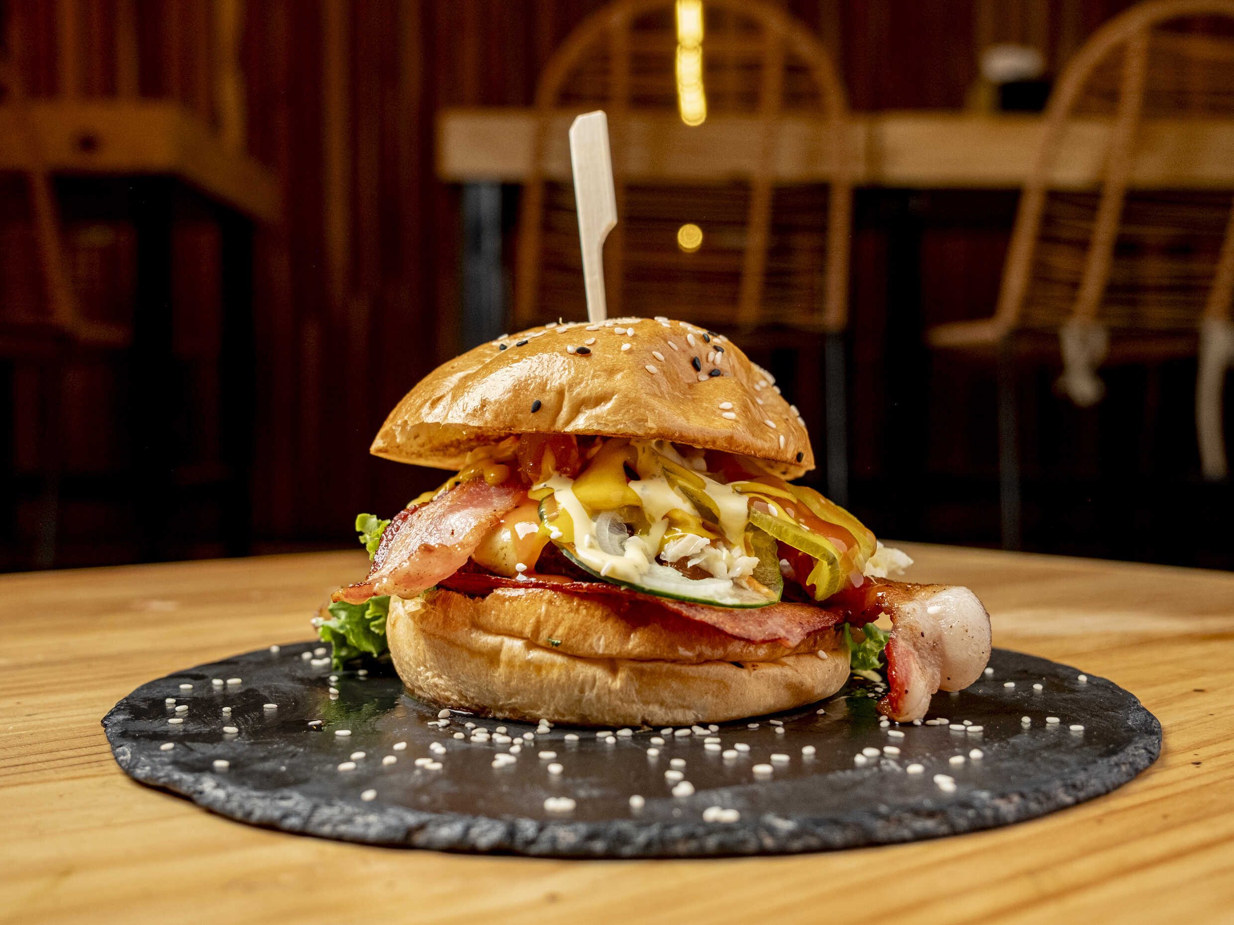 Deliciosa Hamburguesa 100 % carne de res a la parrilla, pan artesanal, queso mozarella fundido con trocitos de piña caramelizada y tocineta, + 10 ingredientes a elegir.