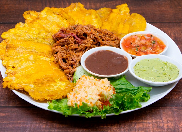 Patacon, Carne o Pollo Mechado, frijoles molidos, guacamole, ensalada y pico de gallo, 5 unidades