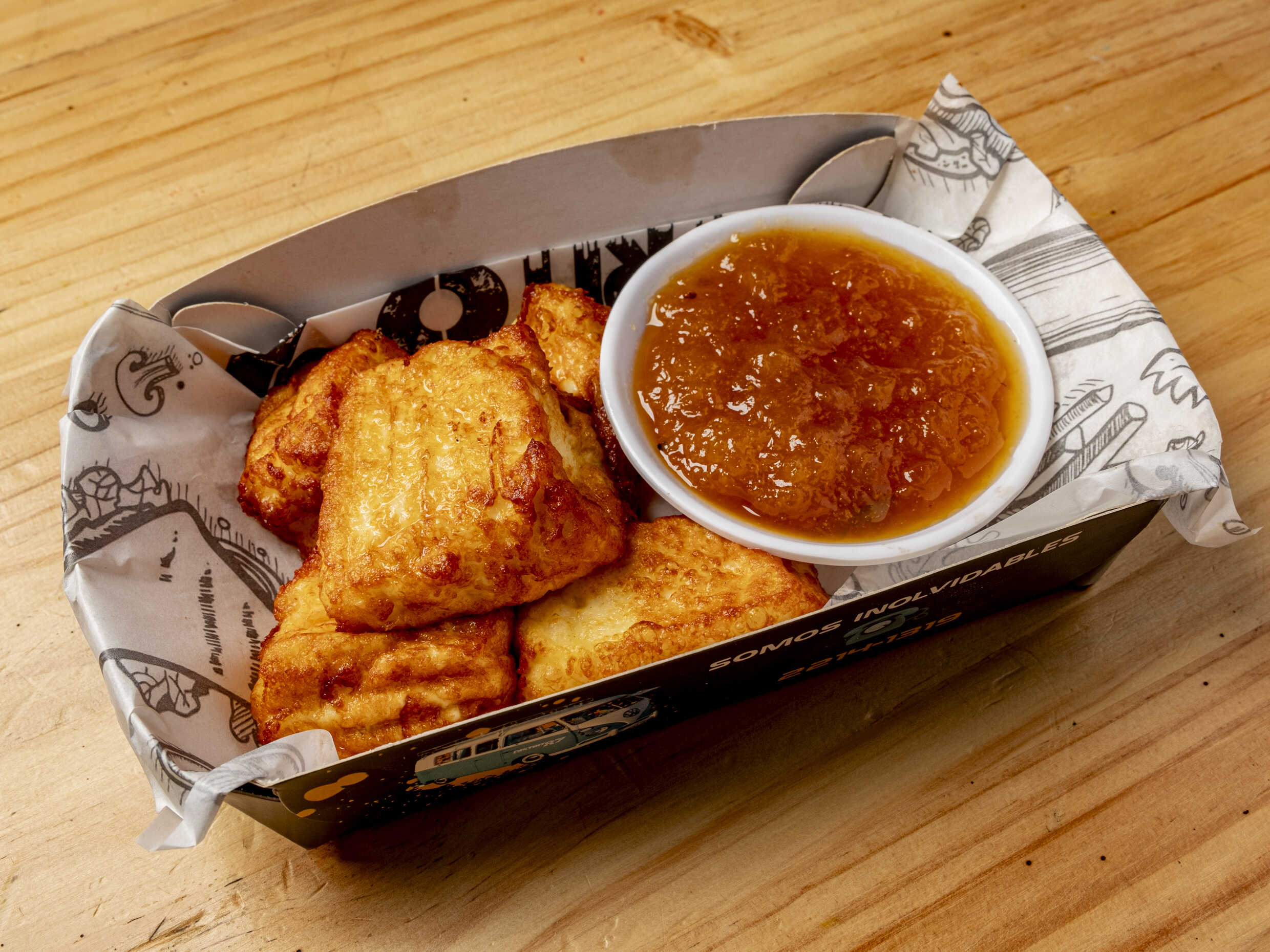 Deliciosos cubos de queso fresco cocidos, acompañados de salsa de piña o salsa Distrito