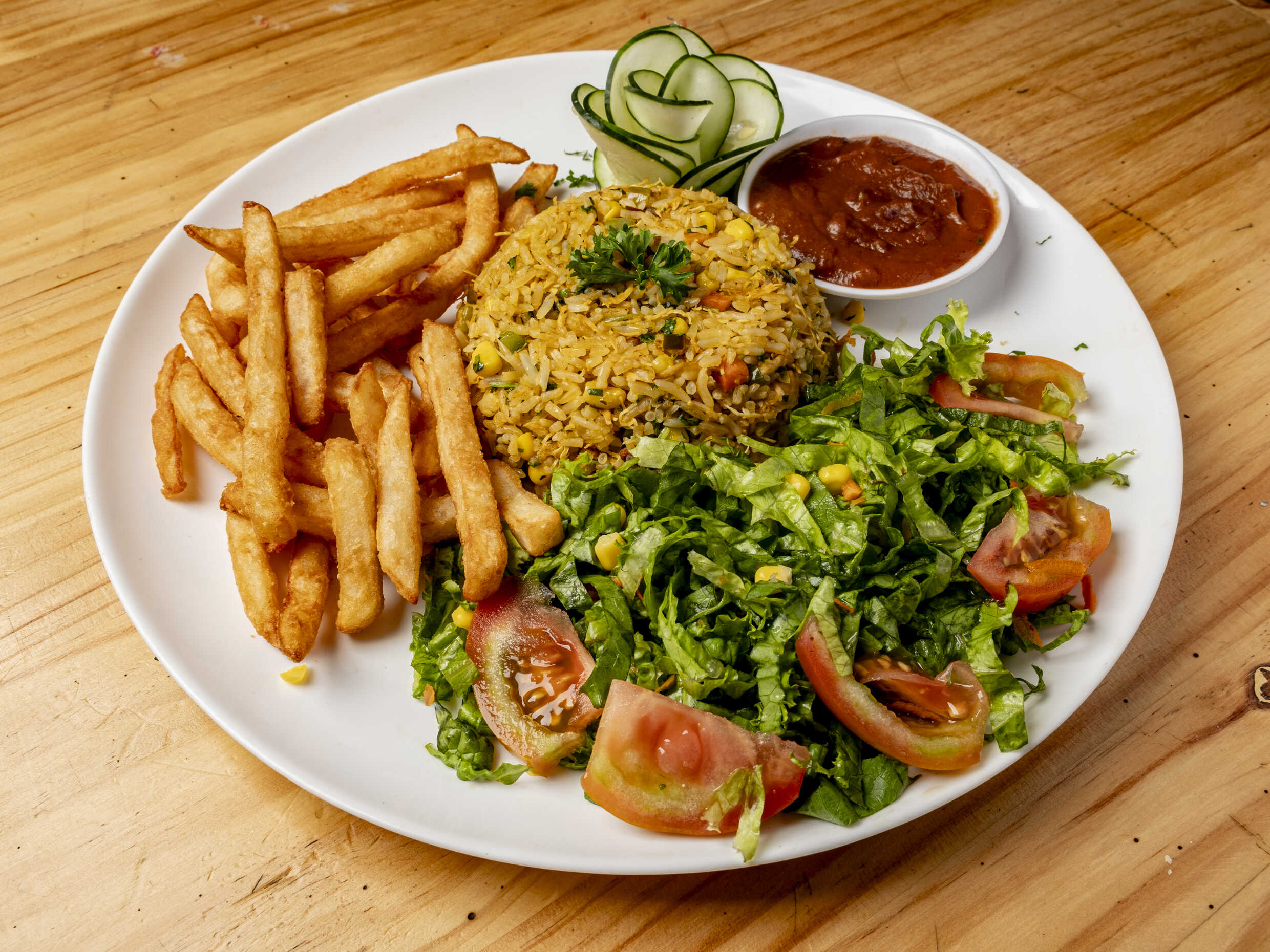 arroz con pollo tradicional acompañado de ensalada, frijoles molidos y papas fritas