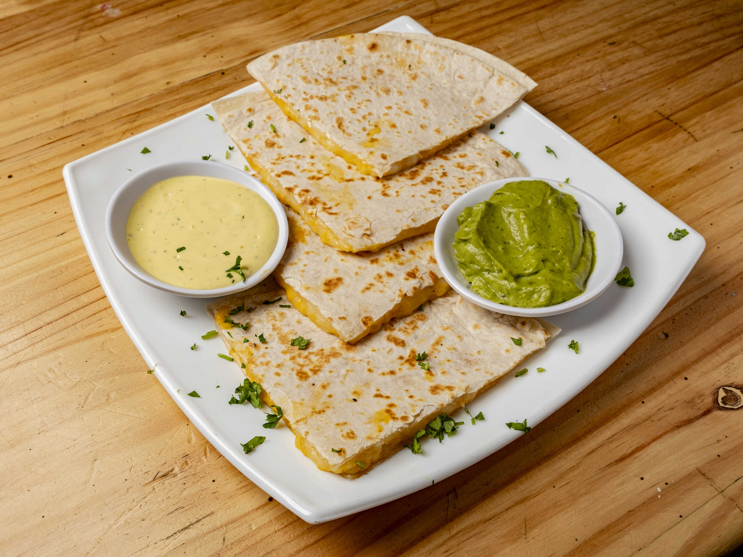3 tipos de quesos derretidos dentro de una tortilla de trigo a la plancha , acompañada de salsa de piña o salsa distrito
