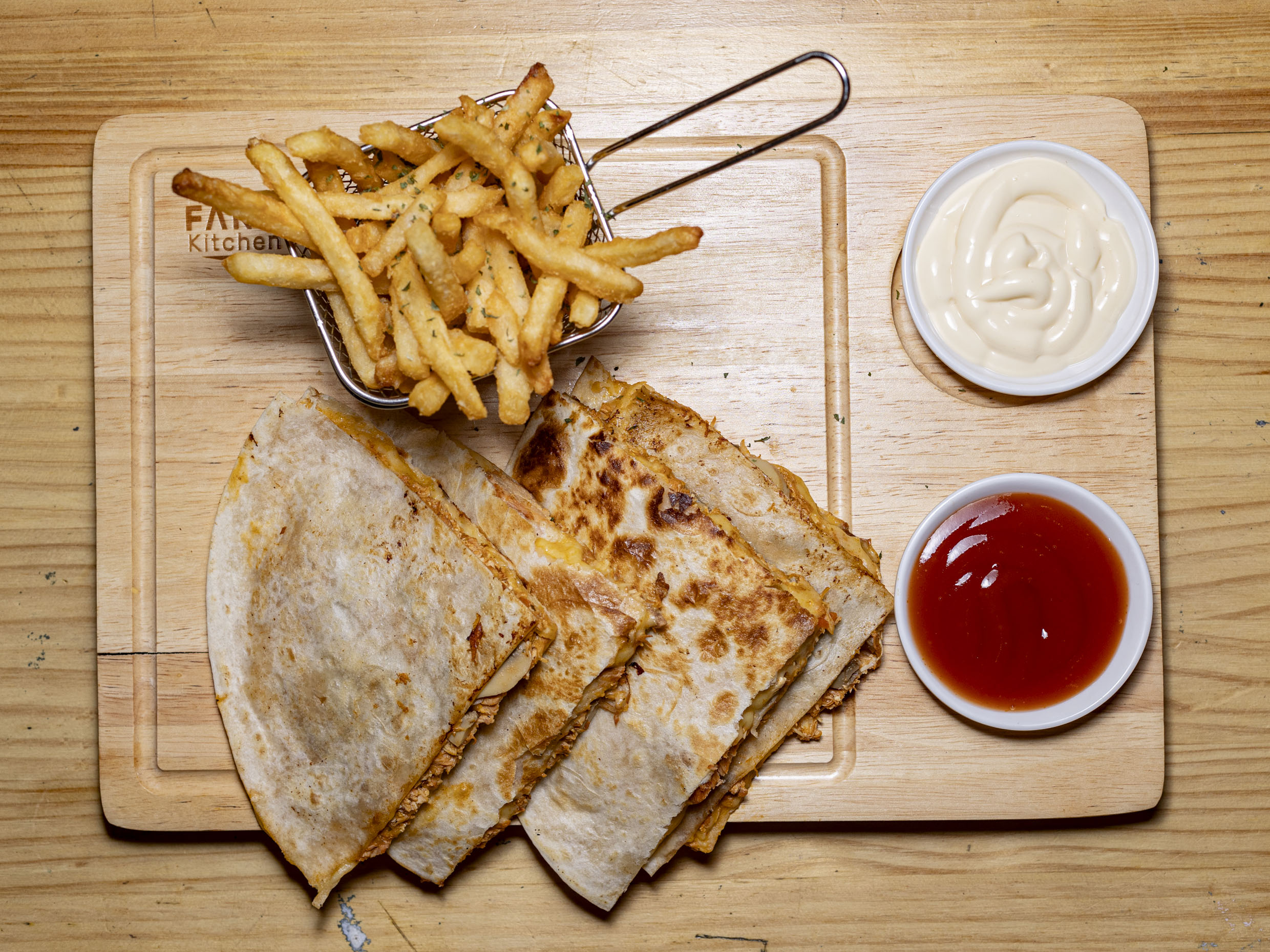 Tienes 4 opciones a e elegir y son 4 quesadillas con corte rectangular de proteína a elegir, queso Mozarella hongos y tocineta, acompañado con Guacamole, Papas Fritas y ensalada