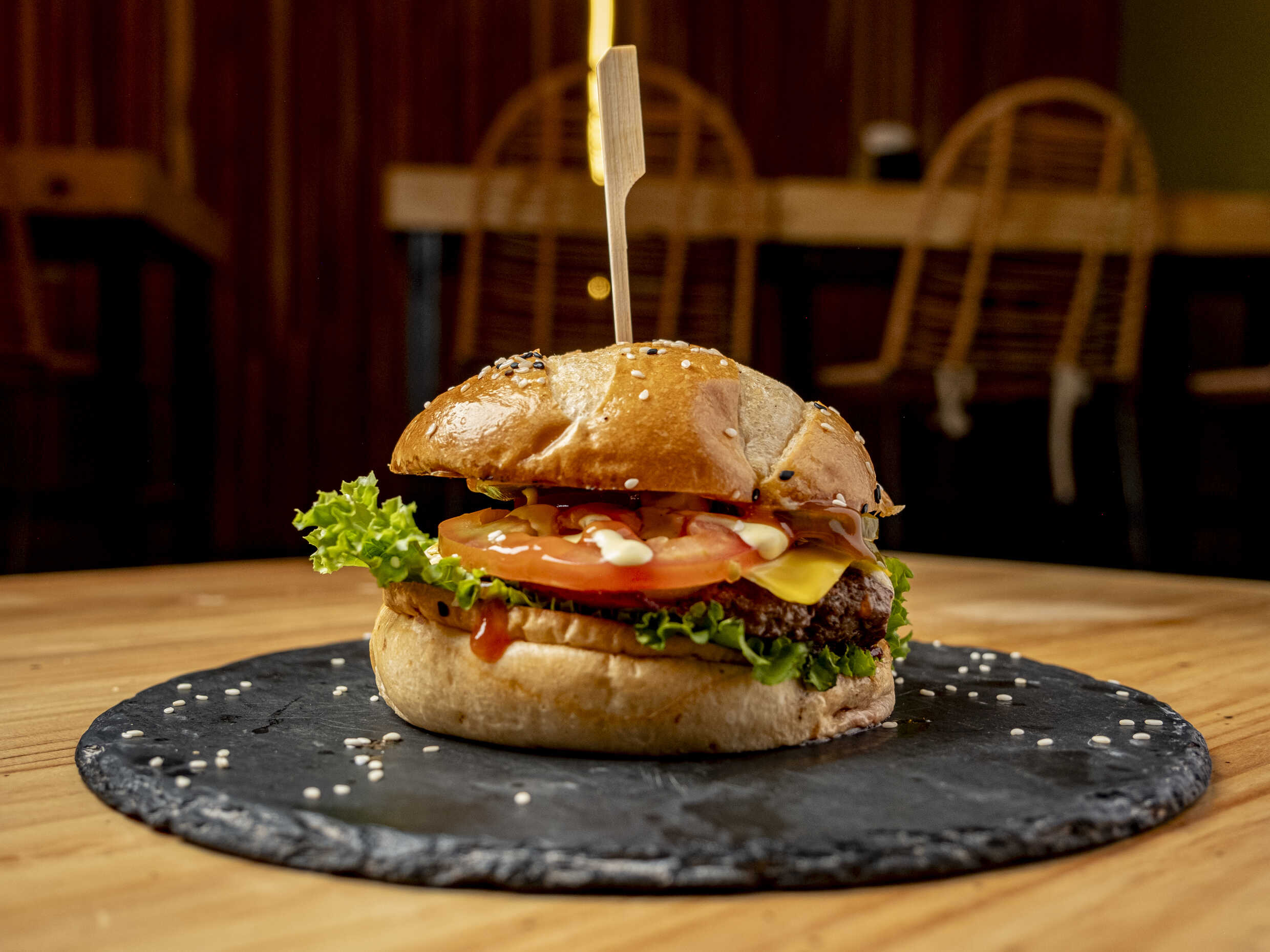 Deliciosa Hamburguesa 100 % carne de res a la parrilla, pan artesanal, queso blanco y queso amarillo, + 10 ingredientes a elegir.