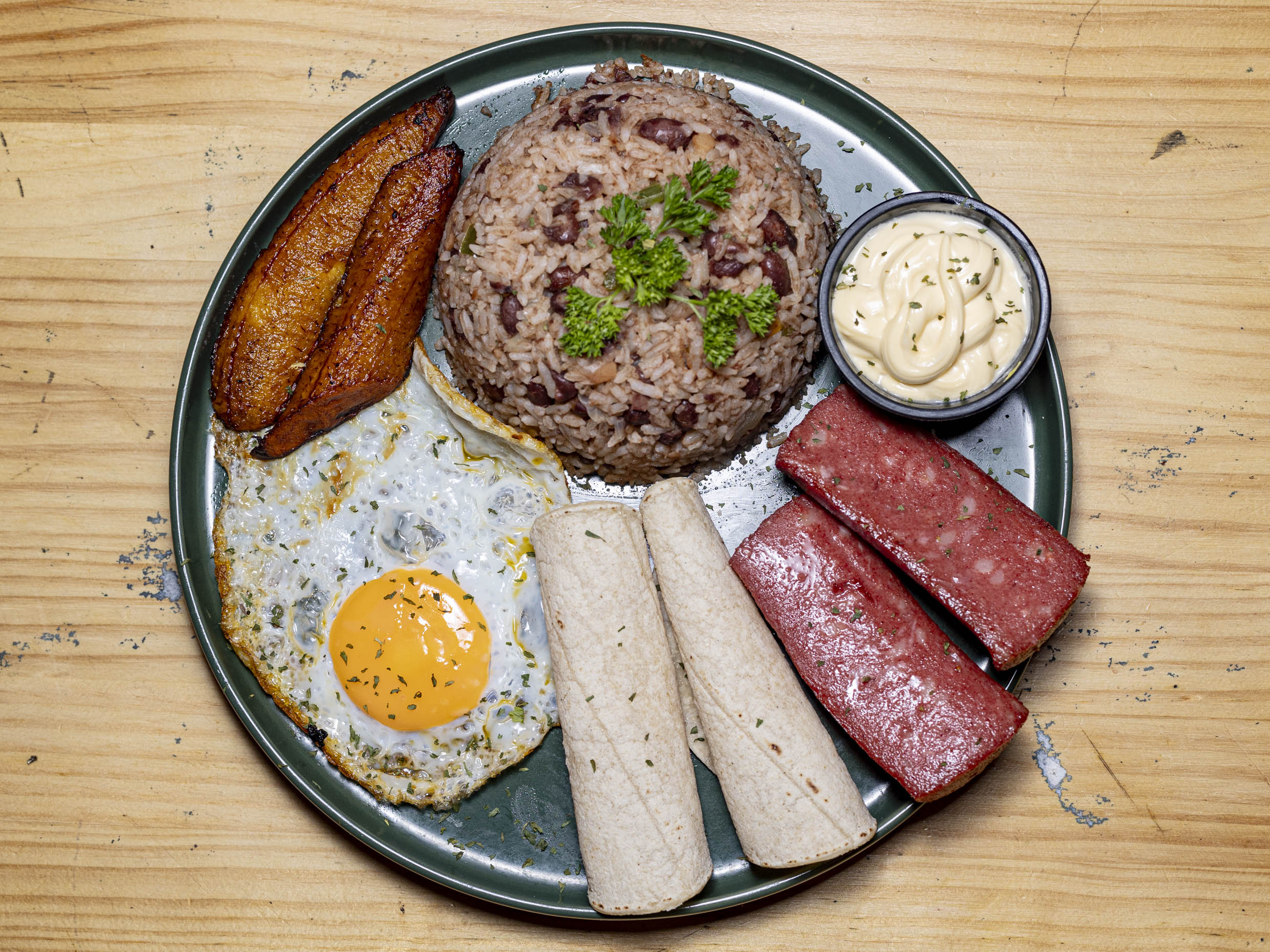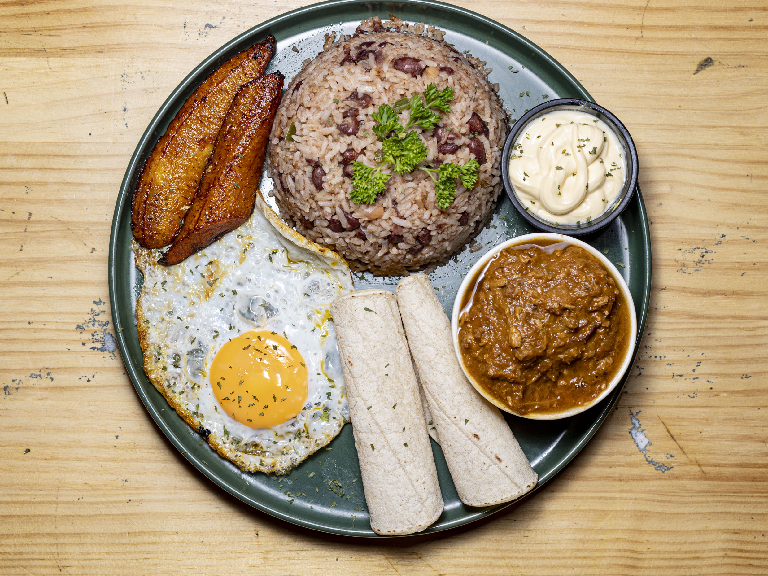 Delicioso pinto acompañado con huevo a elegir, salchichón, maduros, tortilla, natilla y bebida a elegir.