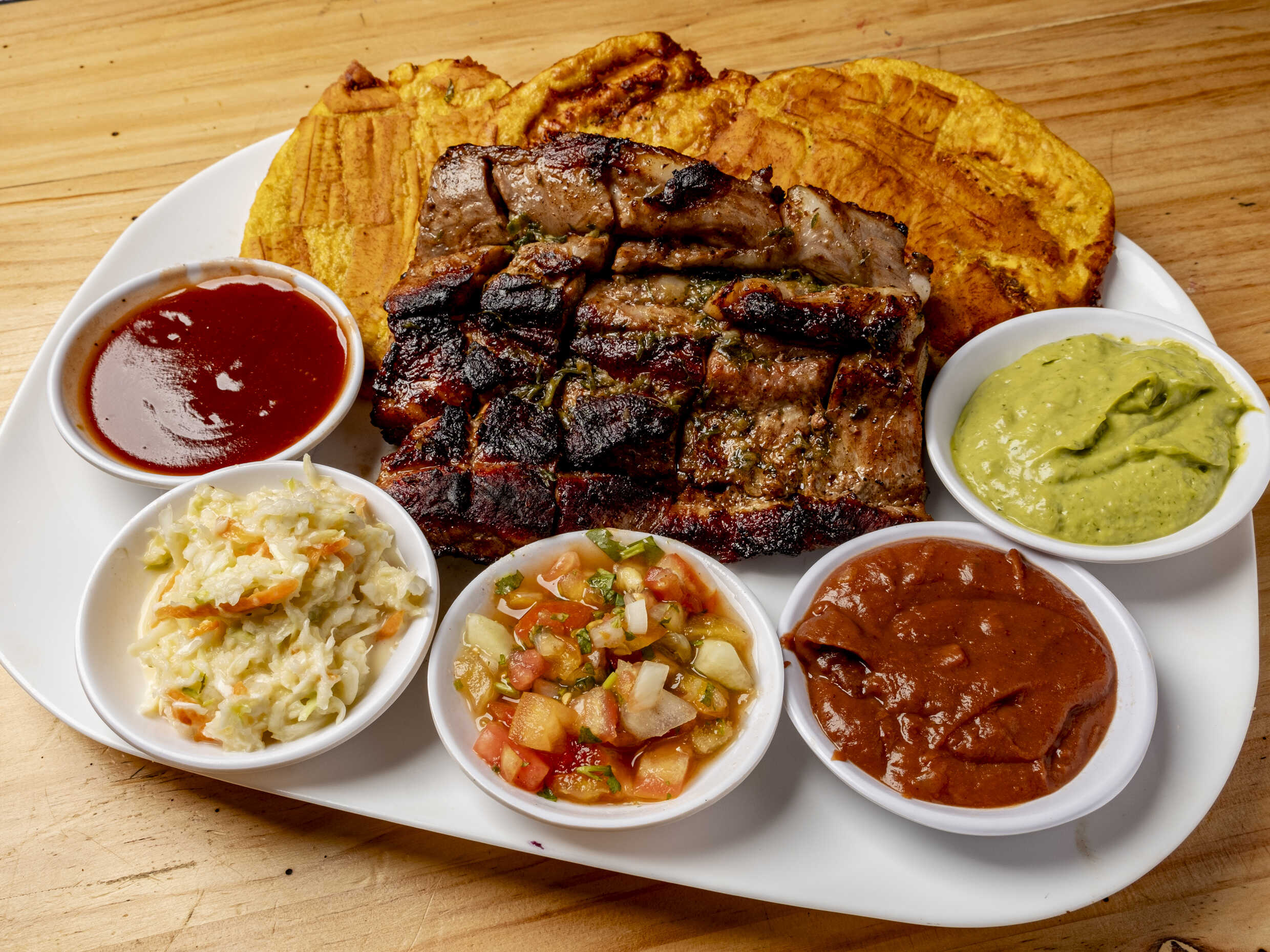 Costilla a la parrilla 450gr, 3 patacones, guacamole, pico de gallo, frijoles molidos y ensalada