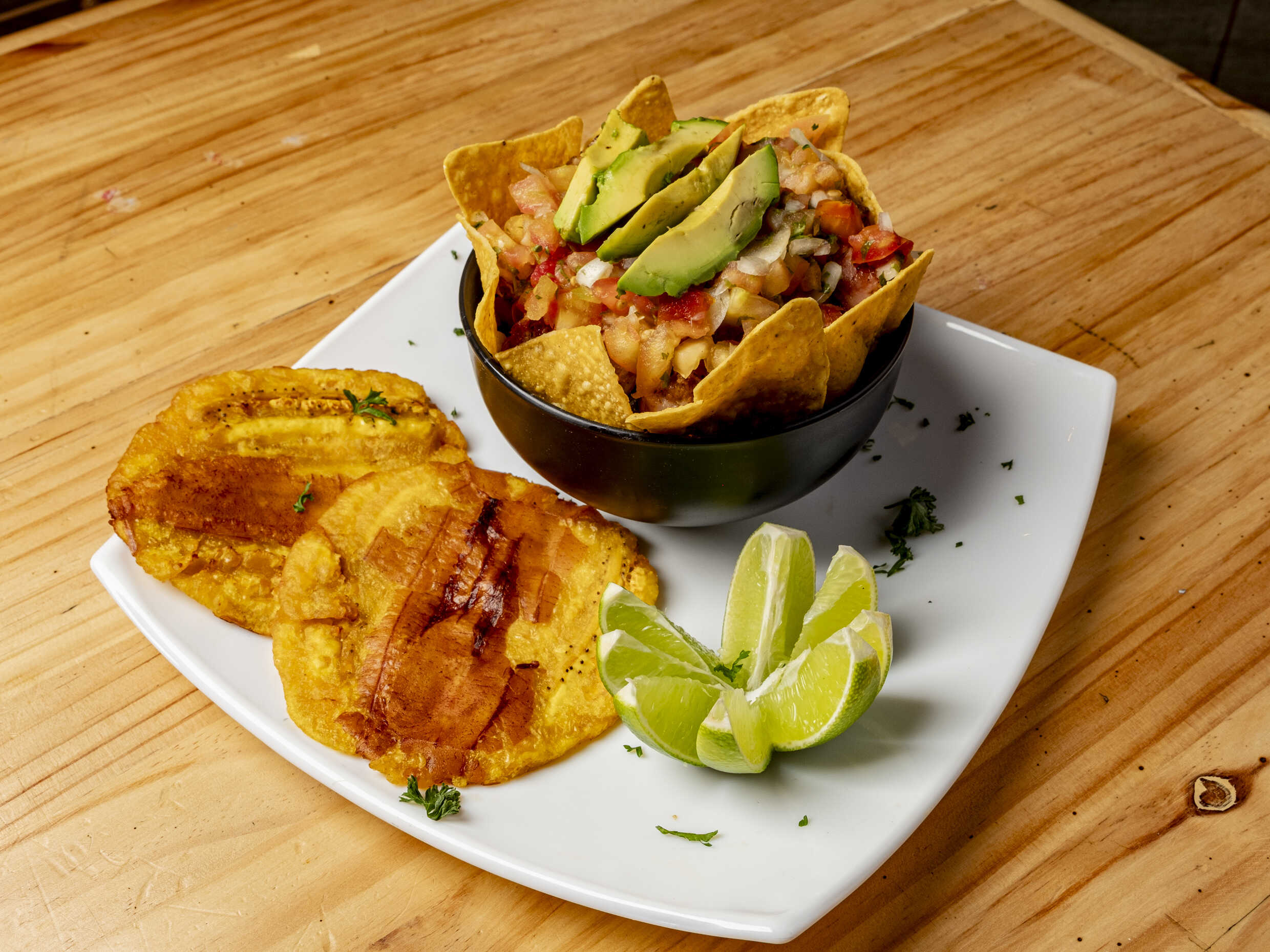 Delicioso platillo costarricense, chicharrón, frijoles, arroz, pico de gallo, aguacate y chips de patacón.