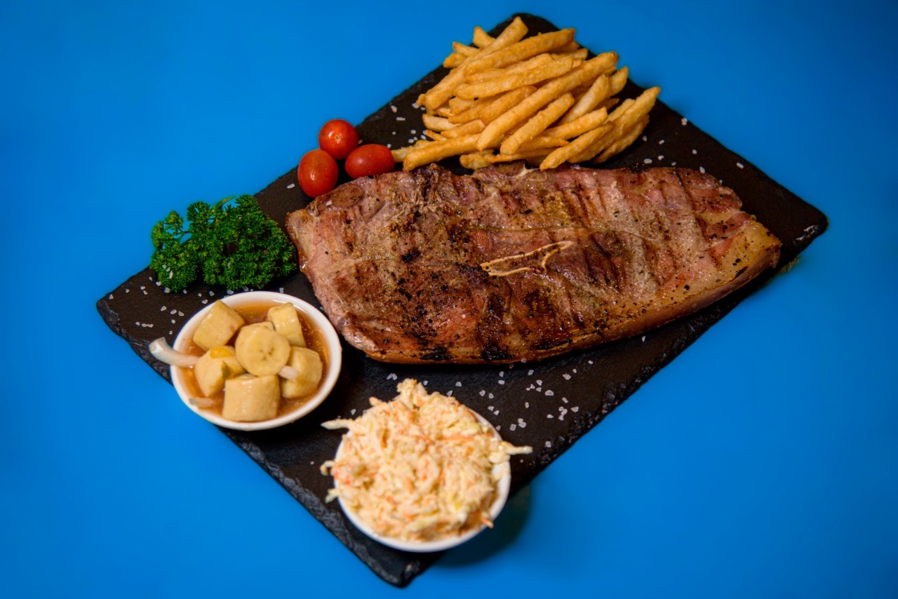 chuletón incluye acompañamientos: bananos en escabeche, papas fritas y ensalada de repollo dulce