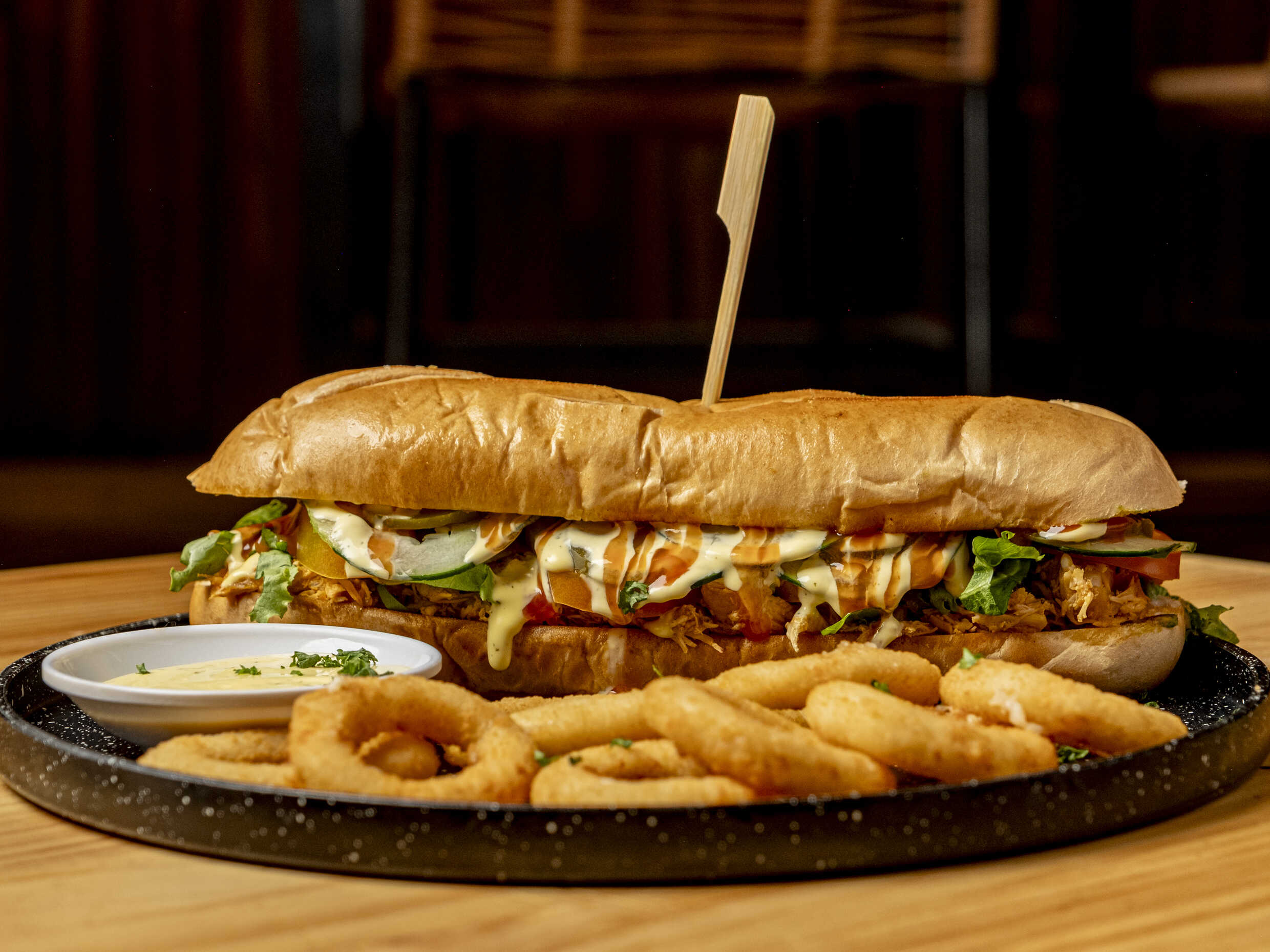 cerdo desmenuzado, ensalada de repollo dulce con pepinillos, salsa especial de la casa, acompañamiento a elegir.