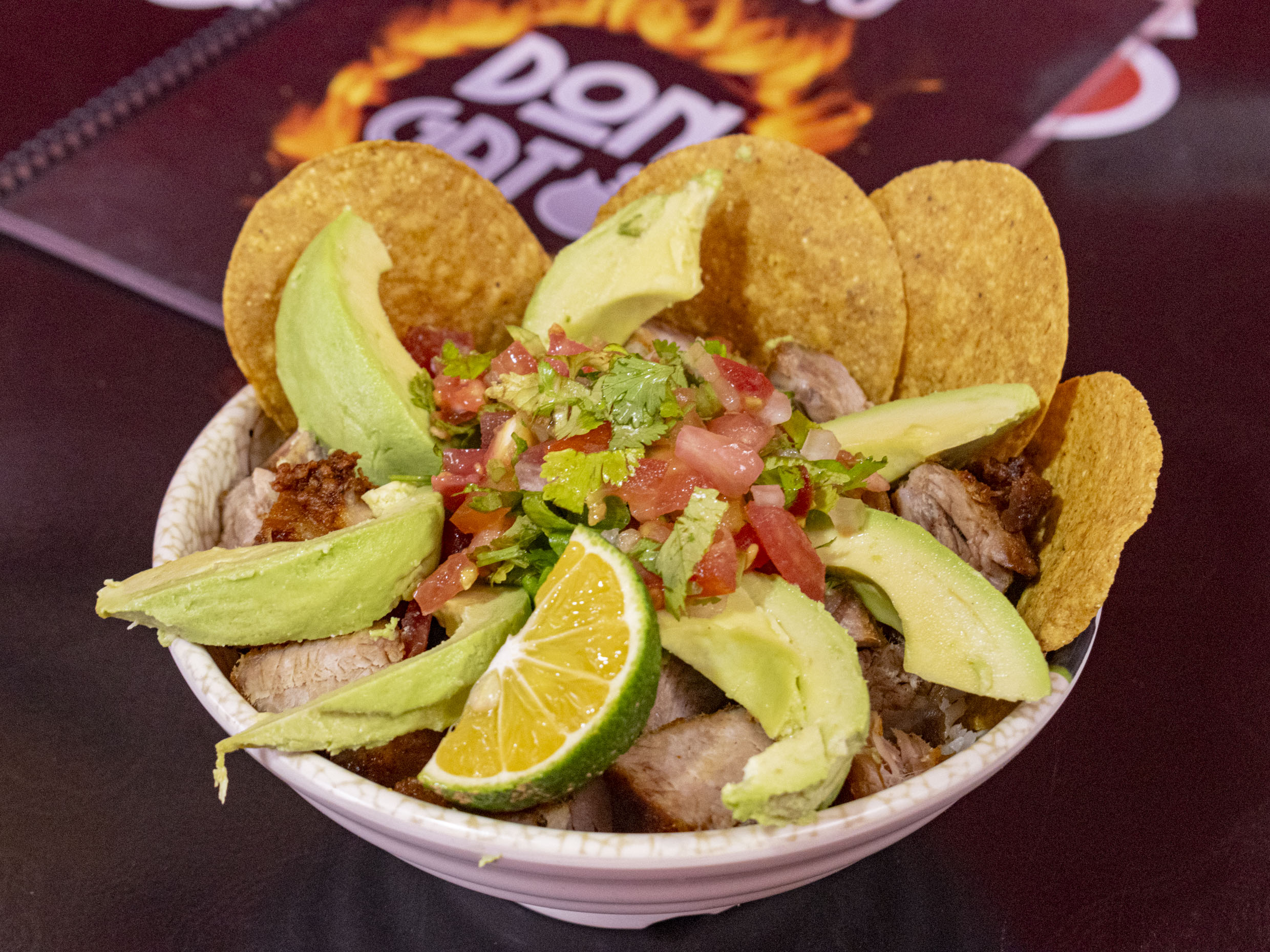 Delicioso chifrijo, con frijol fresco cubas, chicharrón, chimichurri, aguacate