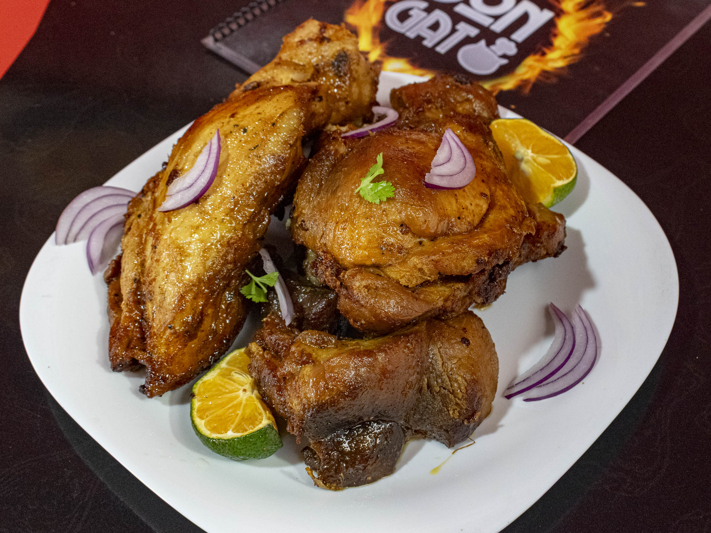 Delicioso pincho con pollo acompañada de una ensalada y limón.
