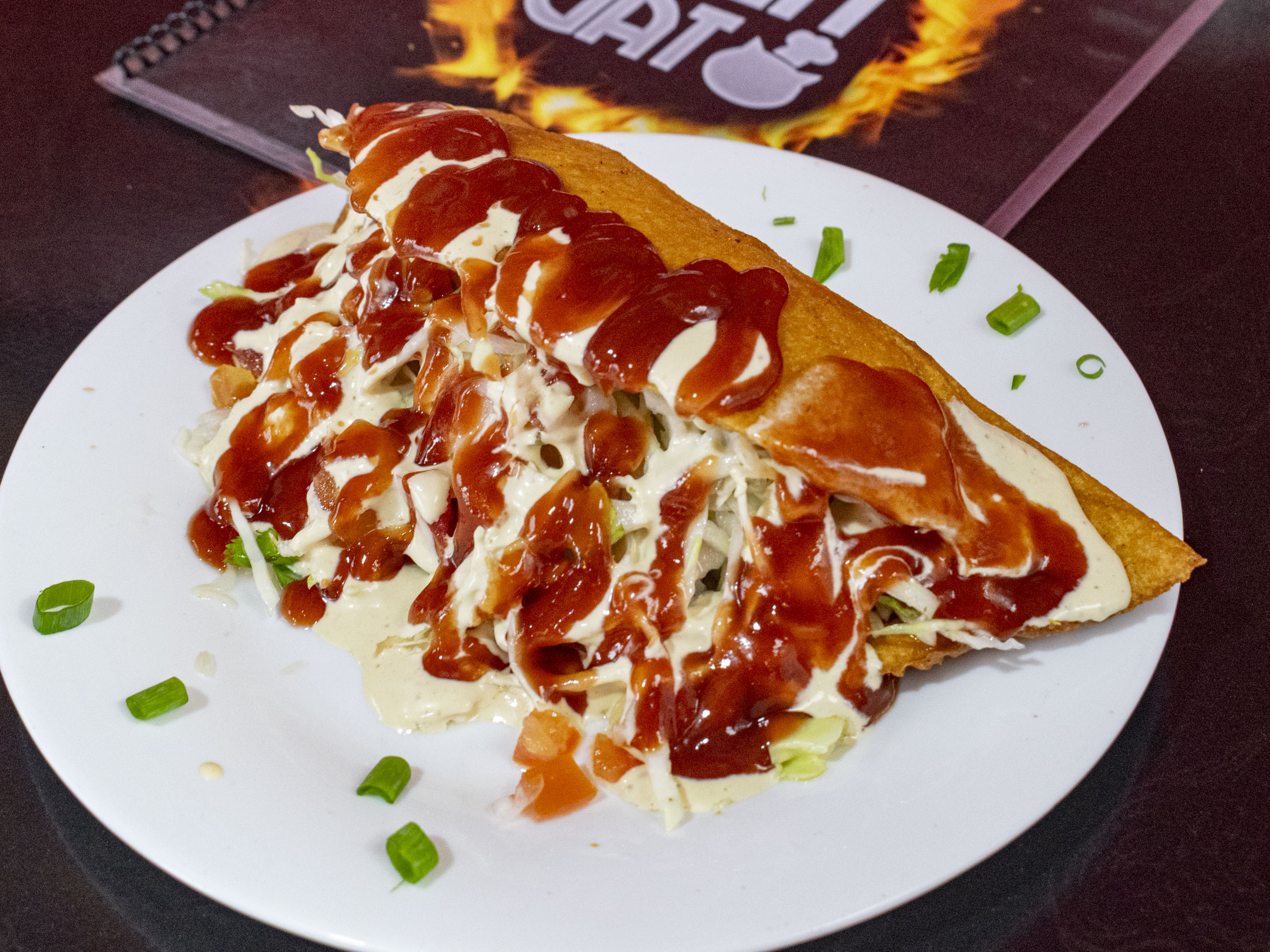 Taco tradicional, con cartucho de tortilla frita, carne de res, repollo y salsa de tomate con mayonesa.