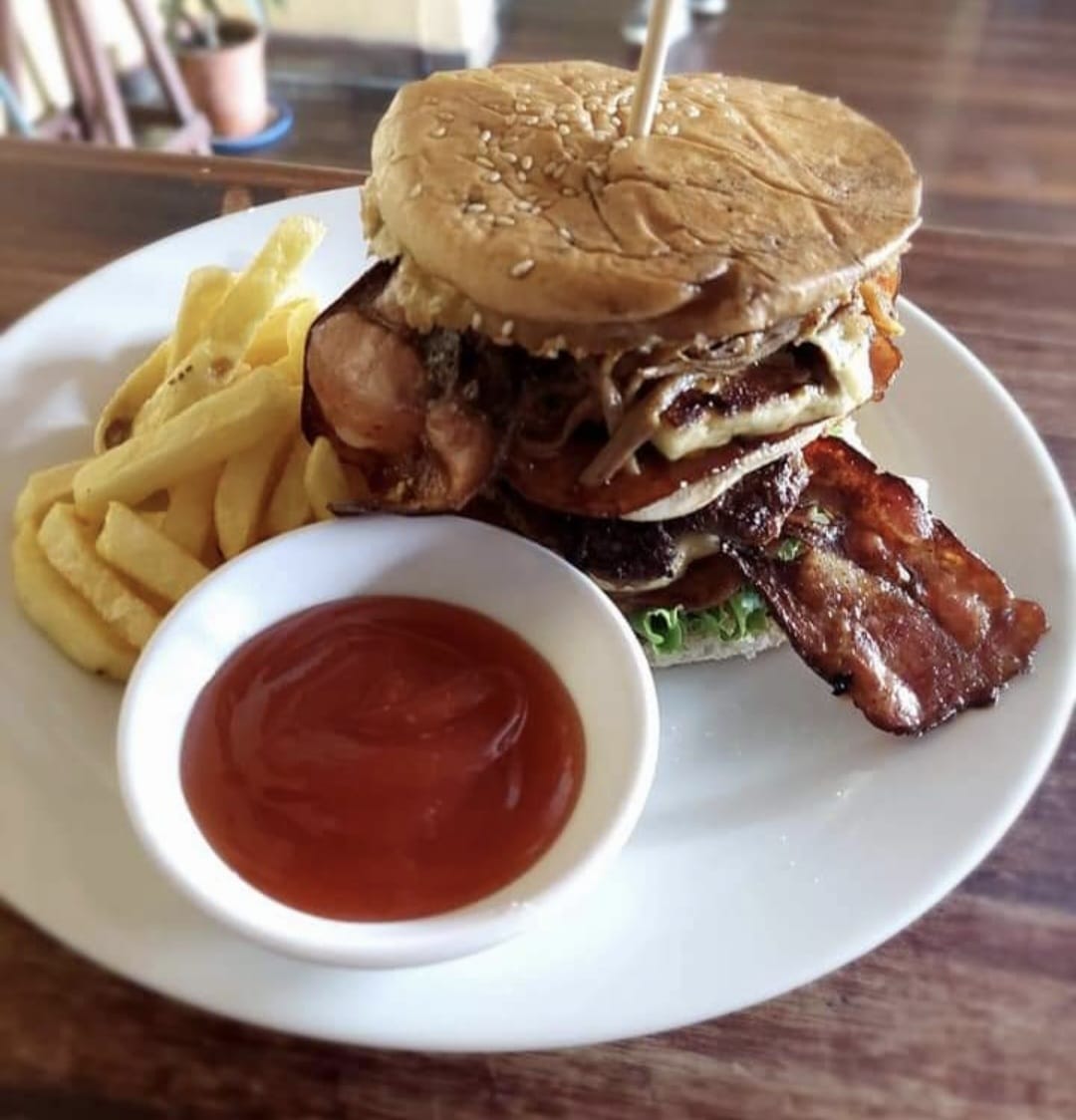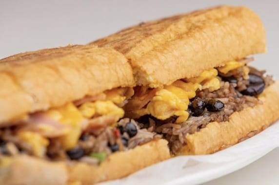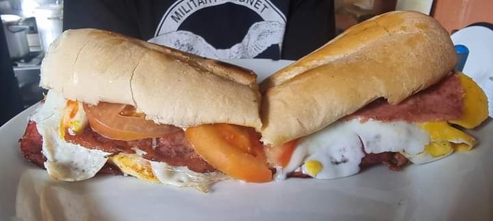 Delicioso pan baguette con dos huevos, dos Quesos y tocineta, bañado con deliciosas salsas
