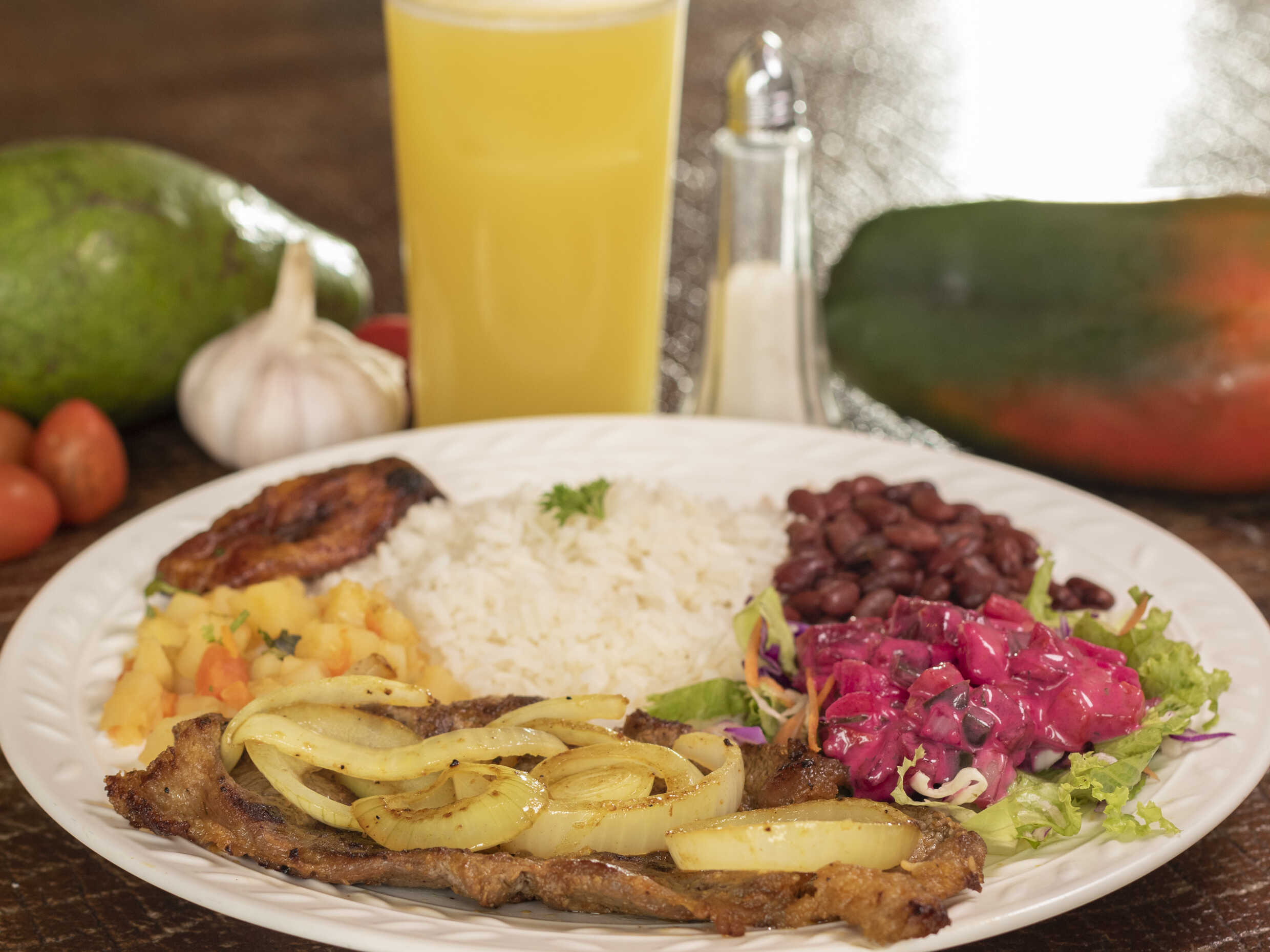 El casado especial incluye: maduro, ensalada, acompañamiento del día, arroz, frijoles, papas fritas y bebida del día.
